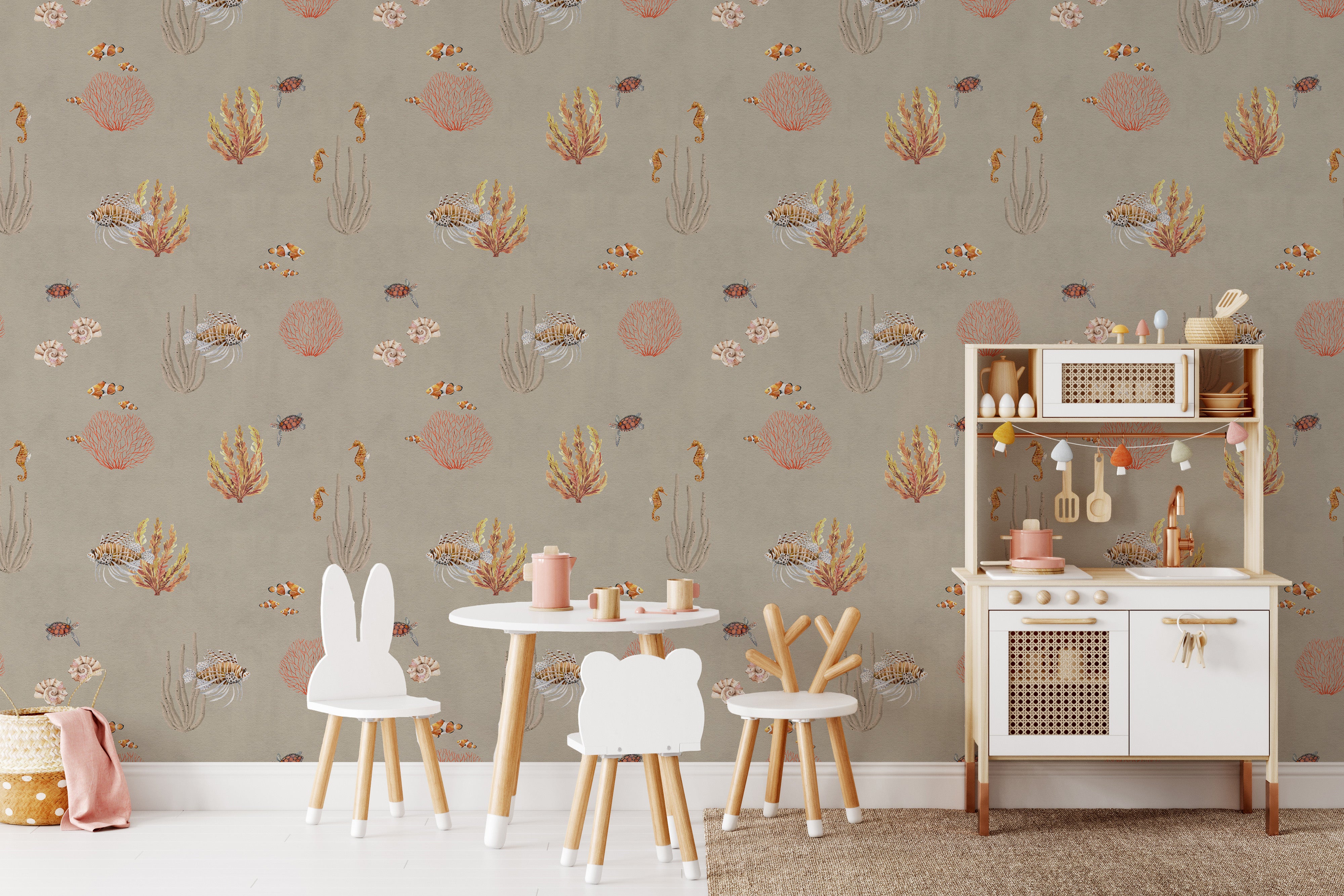 Bring the warmth of the ocean into your space with the Brown Oceanic Wonders wallpaper mural. This stunning design captures the beauty of marine life with earthy brown tones, delicate coral reefs, and intricate sea creatures like seahorses, clownfish, and lionfish. The soft, natural hues create a cozy and inviting ambiance, perfect for coastal-inspired decor, beach houses, or ocean lovers. Crafted from high-quality materials, this wallpaper is easy to install and remove, making it a stylish and practical choice for transforming your walls. Let the elegance of the underwater world add depth and charm to your home or office.