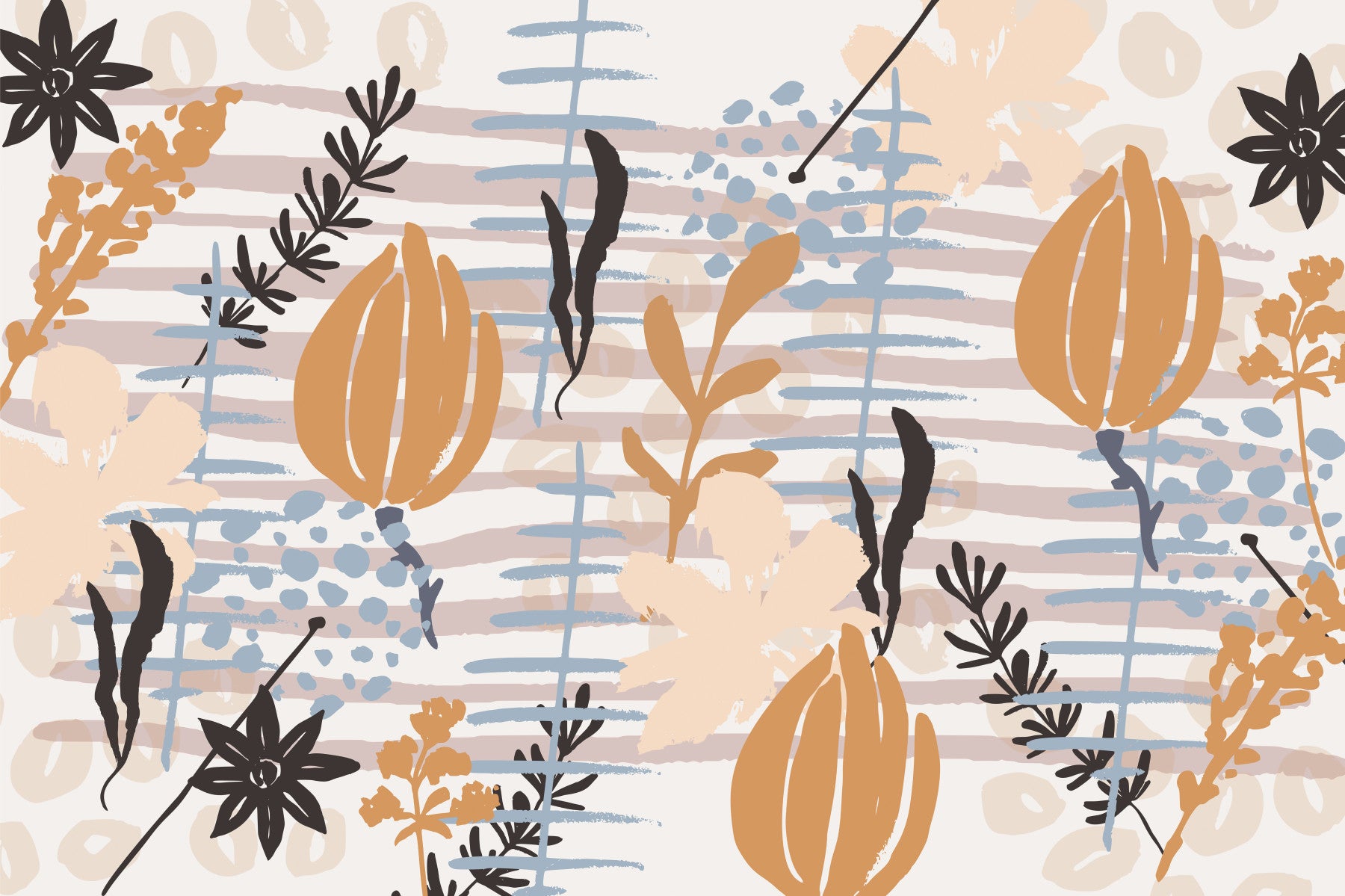 Delight in this playful wallpaper for walls, which presents abstract floral elements. This pattern blends earthy tones like beige, brown, and terracotta with soft blues and blacks. The design features brushstroke flowers and leaves arranged with bold lines and shapes. Imagine this pattern bringing a touch of artistic expression to a living room, bedroom, or hallway. It's a perfect backdrop that complements minimalist or bohemian interiors.
