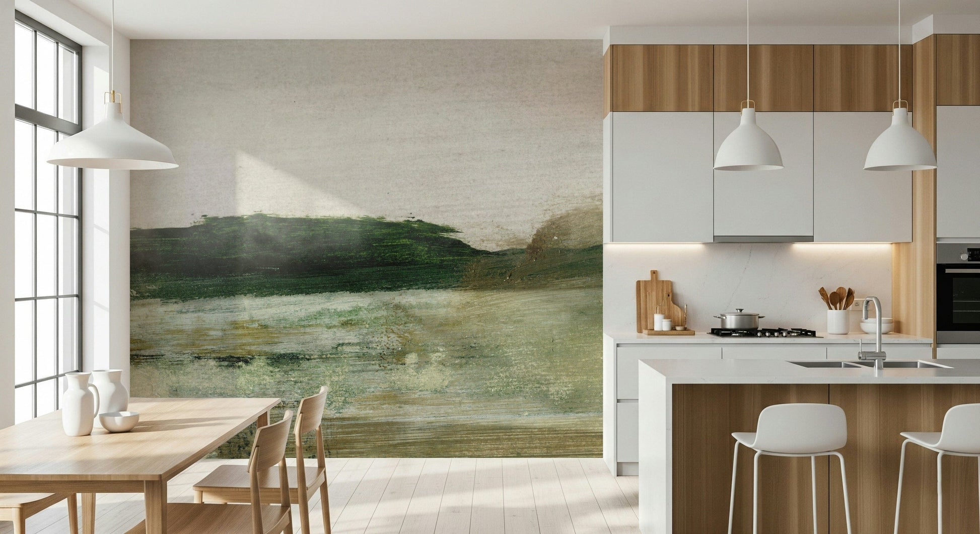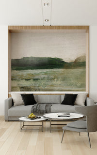 Bring a sense of calm to your space with this gentle landscape. This design features horizontal brushstrokes in muted greens, beige and white, creating an abstract horizon. The colors and texture give it a handcrafted feel. Install this wallpaper for walls in a bedroom or hallway to create a soothing mood. Its subtle beauty will enhance a modern or minimalist interior.