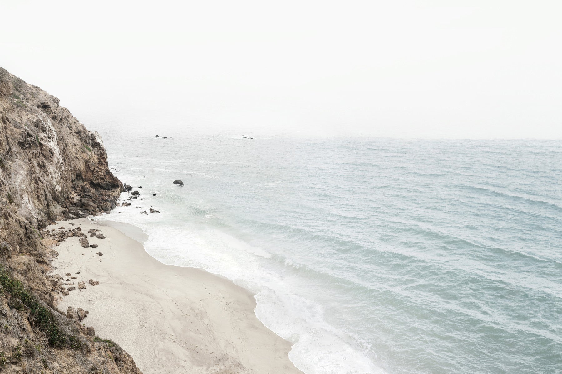 Experience the serene beauty of the California coast with this minimalist wallpaper. A secluded sandy beach gently meets the tranquil, teal ocean, framed by rugged, earthy cliffs. The soft, muted tones and hazy atmosphere evoke a sense of calm and peaceful solitude. This image perfectly captures the understated elegance of the California coastline, offering a tranquil escape for your digital space. The subtle texture of the sand and the gentle movement of the waves create a visually captivating yet peaceful scene.