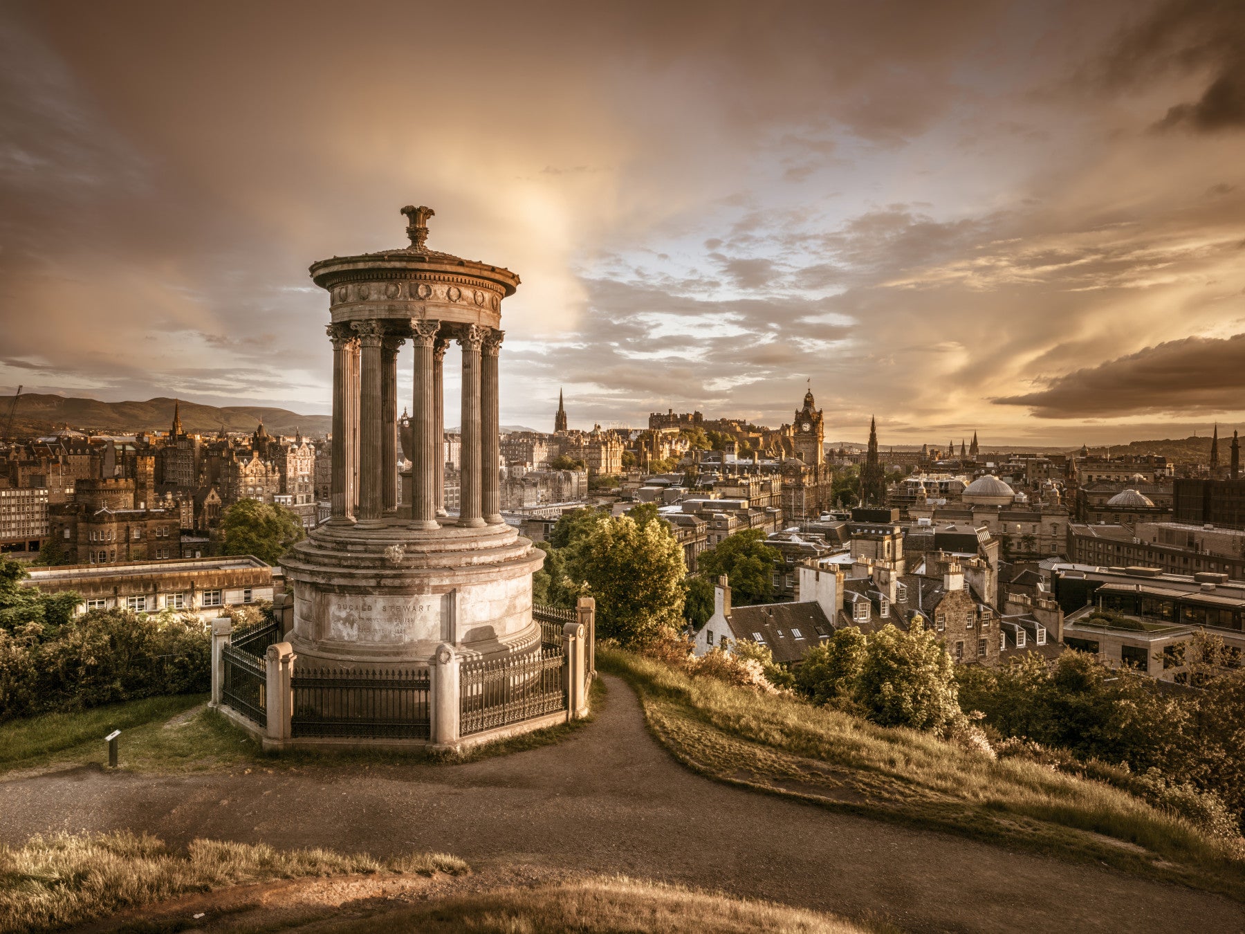 Edinburgh cityscape from Calton Hill, Scotland. Ascend to serenity with 'Calton Hill,' a breathtaking wallpaper that captures the golden hour over Edinburgh. This image presents a stunning panoramic view from the iconic Calton Hill, dominated by the elegant Dugald Stewart Monument. As the sun dips below the horizon, the sky blazes with warm hues of orange and gold, casting a magical glow over the cityscape. Edinburgh Castle, nestled atop its volcanic rock, stands proudly amidst a tapestry of historic buildings and winding streets. The image evokes a sense of timeless beauty, inviting you to immerse yourself in the rich history and architectural grandeur of Scotland's capital. Perfect for adding a touch of sophistication and wanderlust to any screen, 'Calton Hill' is a visual escape to a city steeped in culture and history.