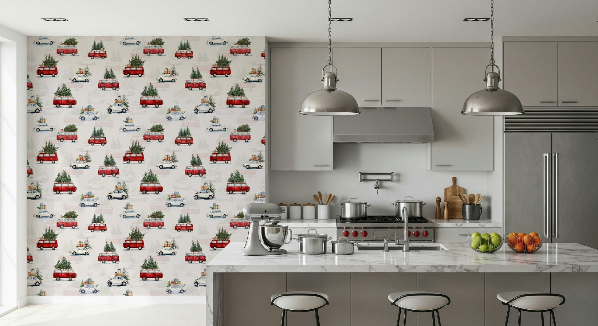 Whimsical wallpaper design featuring tiny delivery vans for a nostalgic yet modern look.