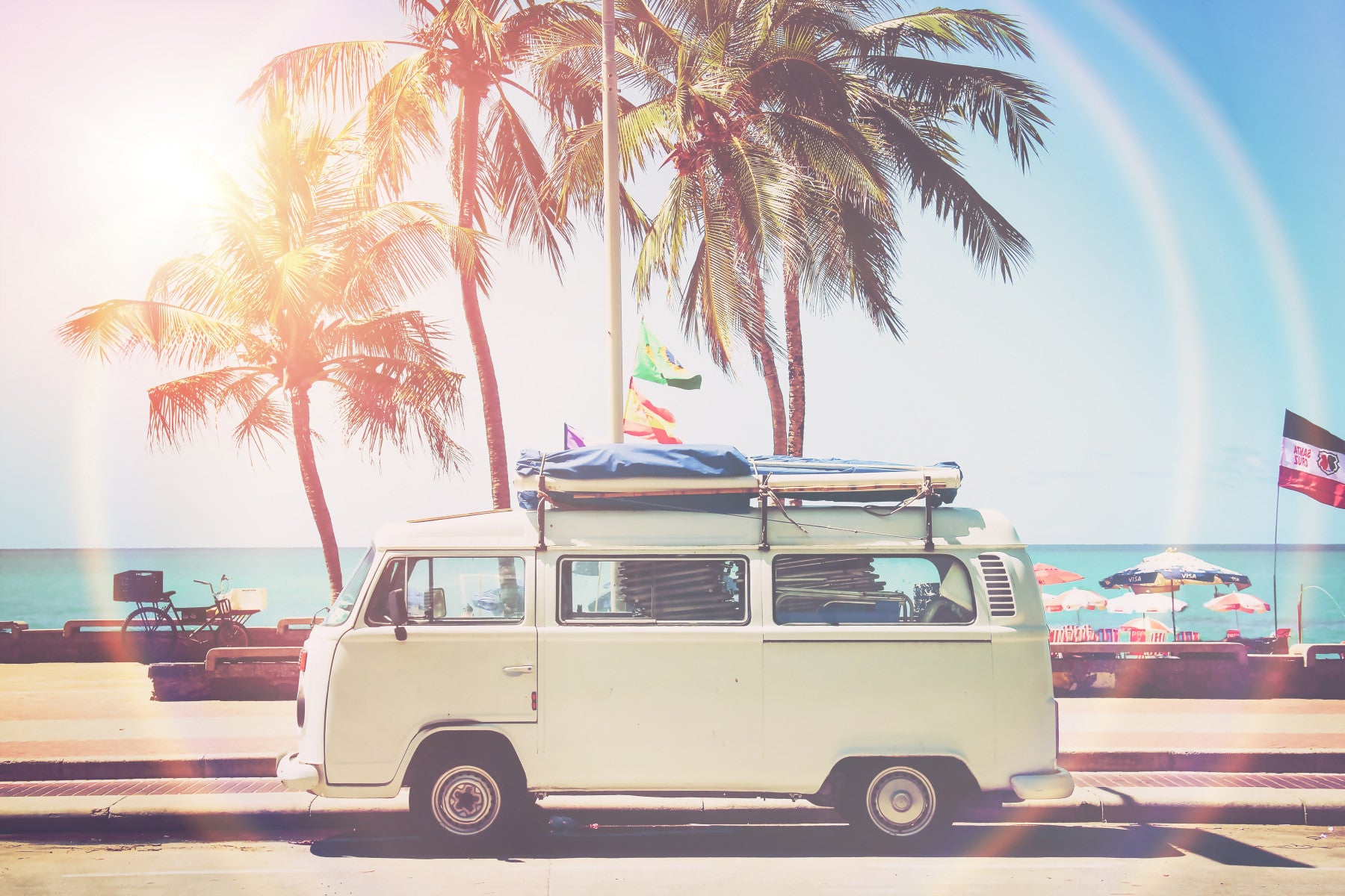 Embrace the ultimate summer escape with this vibrant wallpaper featuring a classic camper van parked idyllically beside a tropical beach. Bathed in warm sunlight, the vintage white van, adorned with surfboards and flags atop, exudes a carefree spirit. Towering palm trees sway gently in the background, creating a picturesque scene of relaxation and adventure. This image perfectly encapsulates the freedom and wanderlust associated with road trips and coastal getaways, offering a nostalgic yet modern aesthetic for your digital devices.