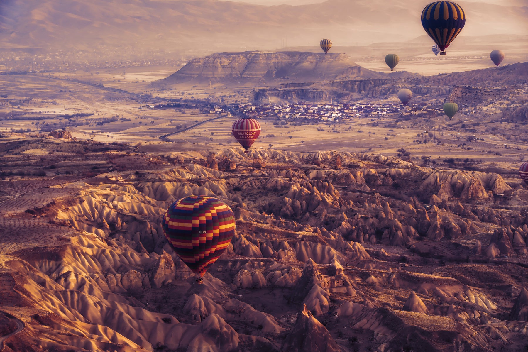 Drift away to a world of wonder with "Cappadocia Dreams," a breathtaking wallpaper that captures the ethereal beauty of Cappadocia's iconic hot air balloon spectacle. Witness a tapestry of vibrant balloons gracefully ascending over the surreal landscape, their colorful patterns contrasting against the soft, hazy sunrise. The unique rock formations, sculpted by centuries of wind and water, create a dreamlike panorama, stretching towards the horizon where a charming village nestles amidst the fairy chimneys. This image evokes a sense of tranquility and adventure, inviting you to escape the ordinary and embrace the magic of this otherworldly destination. Let "Cappadocia Dreams" transform your screen into a window to a land of enchantment, inspiring wanderlust and a sense of limitless possibility with every glance.