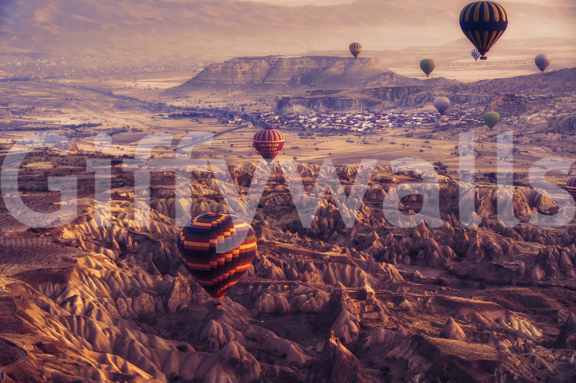 Hot Air Balloons in Cappadocia Wall Mural – Vibrant mural depicting colorful balloons drifting over the fairy chimneys and valleys.