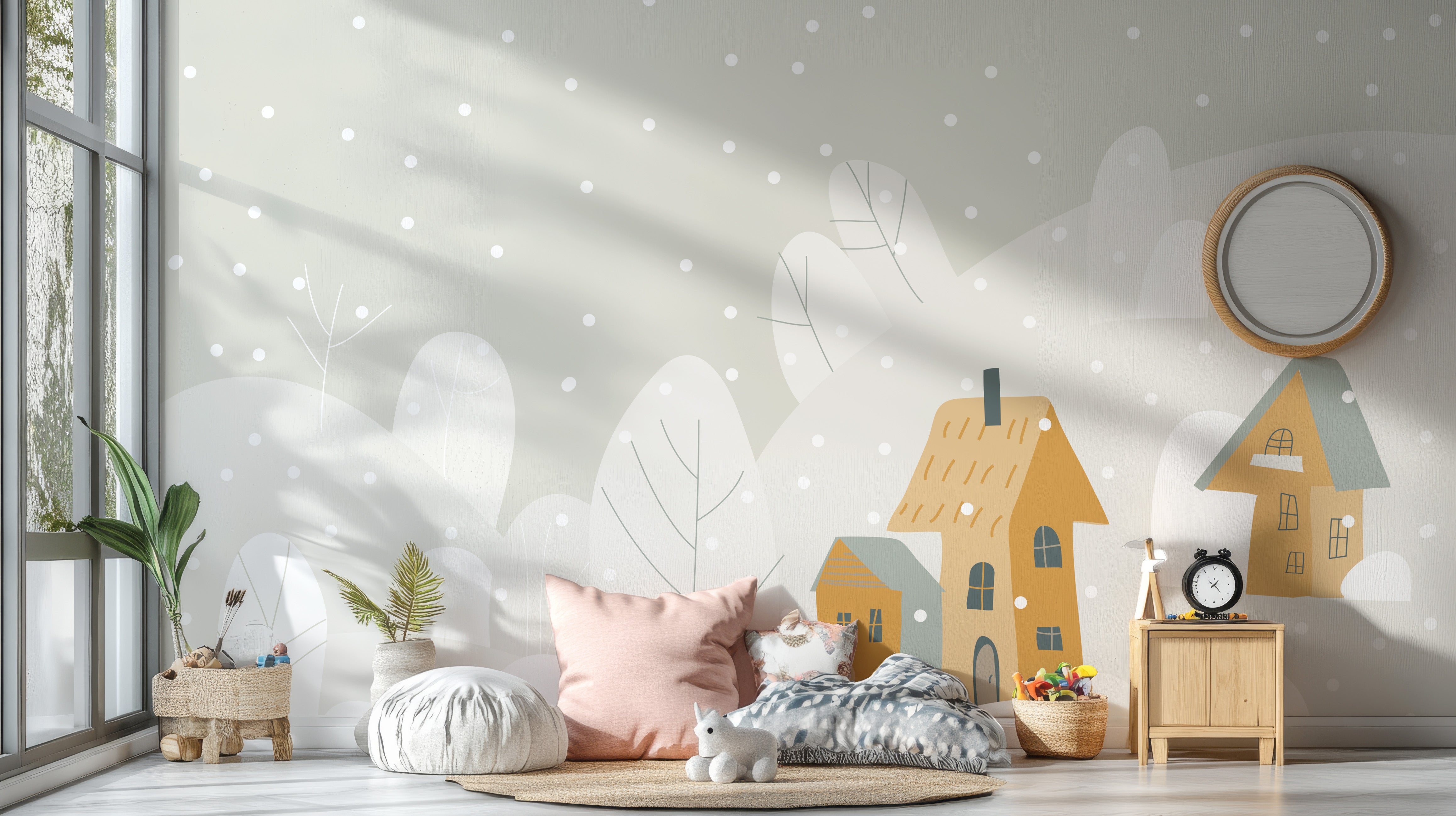 Easy to apply and made with high-quality materials, this cartoon wallpaper for kids rooms is durable and will maintain its beauty over time. Whether you're redecorating a child's room or looking for a fun update to your home, the Cartoon Winter Cottages Wallpaper Mural is a perfect choice. It's a simple way to make any room livelier and more welcoming.