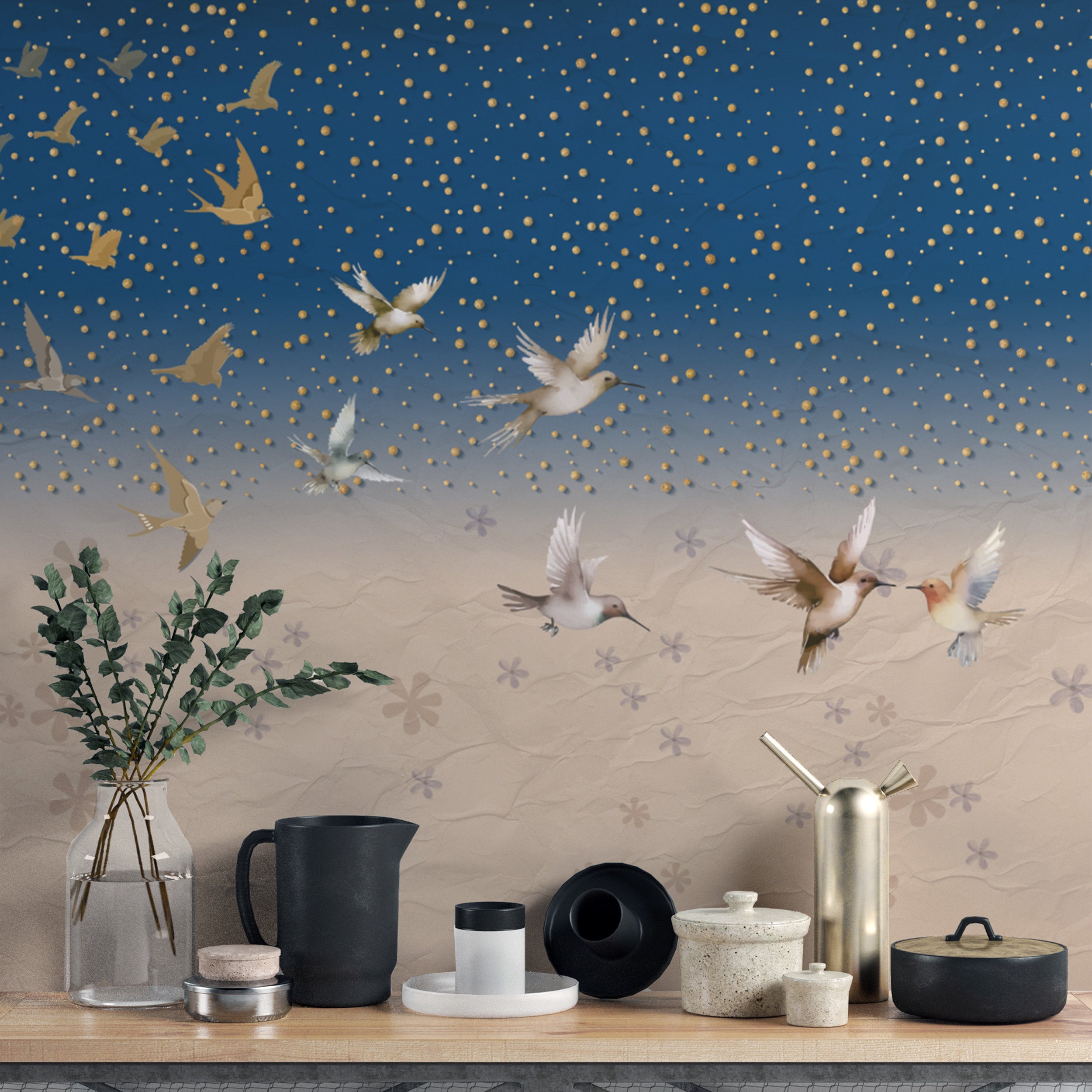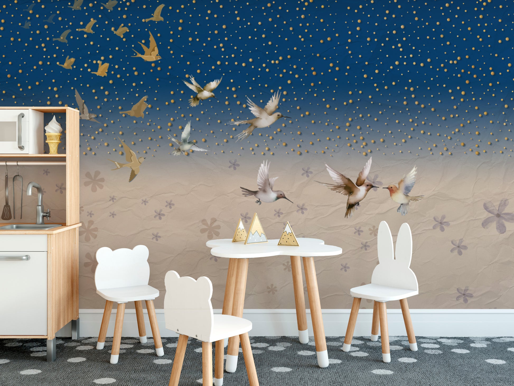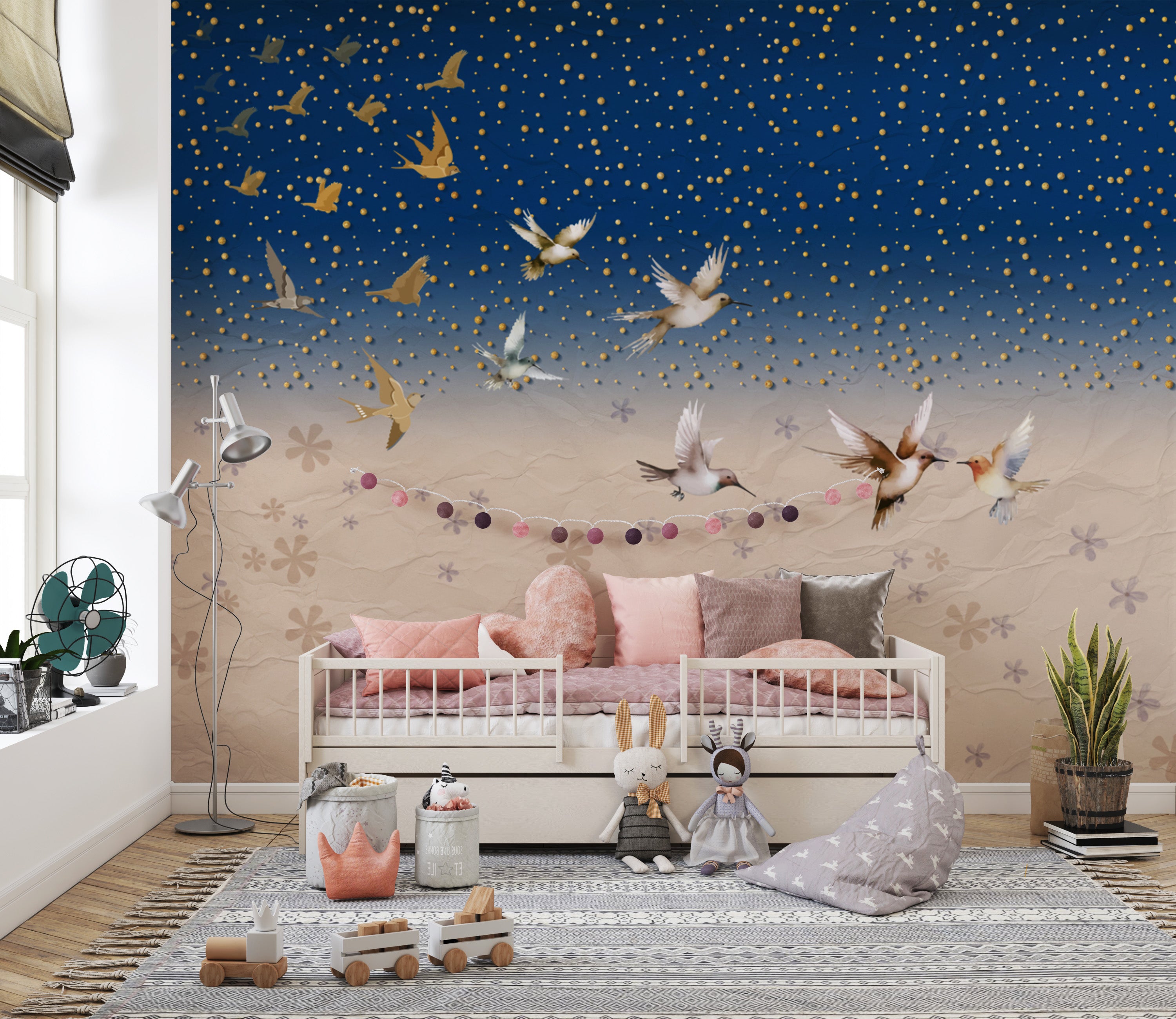 Celestial birds starry sky wallpaper brings a dreamy nighttime atmosphere to any room. Featuring golden stars against a deep blue sky, this design creates a celestial wonderland filled with graceful birds in flight. The soft floral details on a textured beige backdrop enhance the vintage-inspired aesthetic. This wallpaper blends cosmic beauty with nature's charm and is ideal for bedrooms, nurseries, or living spaces. The rich hues and intricate patterns add warmth and character, making walls stand out effortlessly. Crafted with high-quality materials, it ensures durability and a premium finish. Celestial bird wallpaper with a starry sky theme brings elegance and style to the interiors.