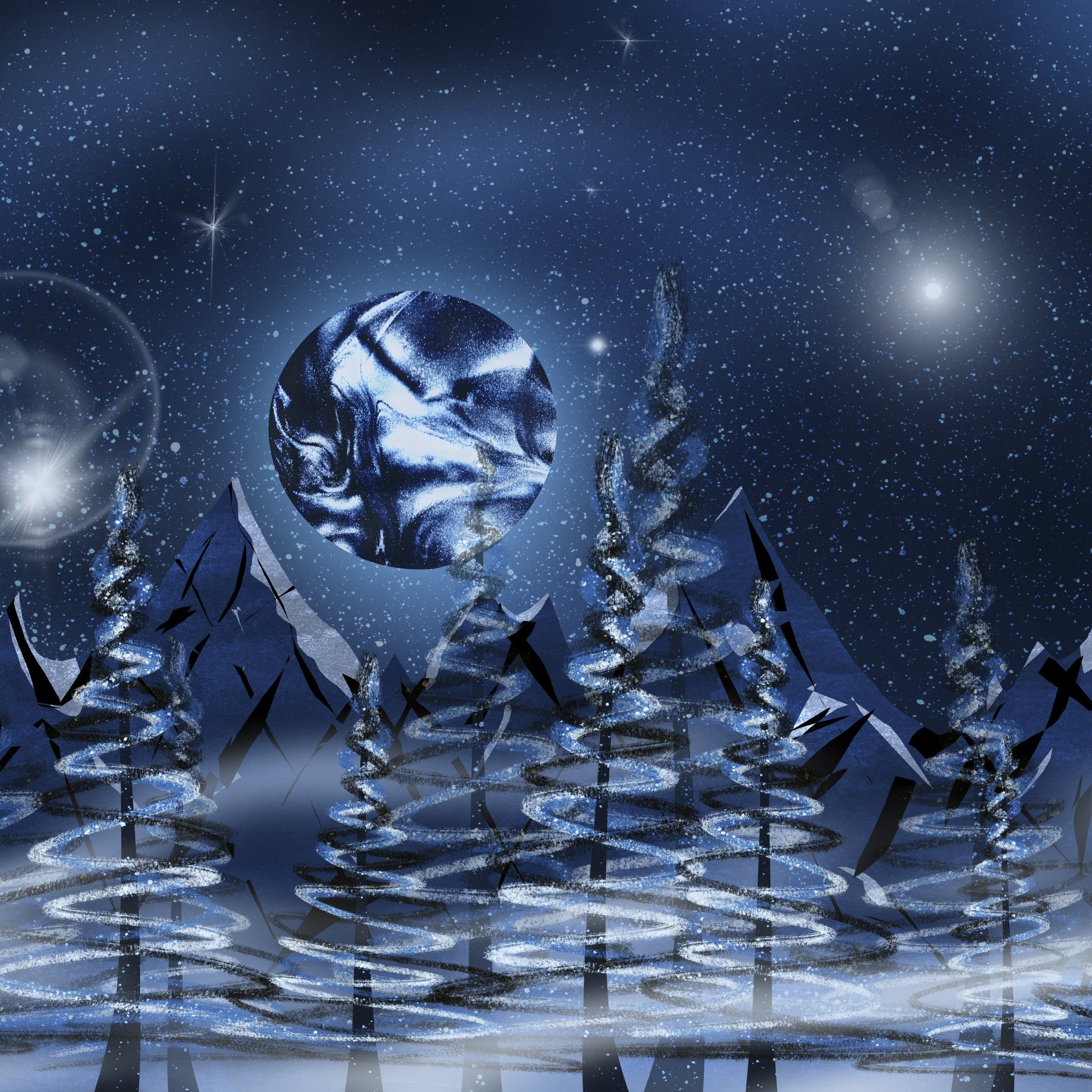 Immerse yourself in the magic of 'Celestial Pines,' a breathtaking wallpaper depicting a winter wonderland under a vast, starlit sky. Stylized pines stand silhouetted against a backdrop of majestic mountains, bathed in the soft glow of a unique, marbled moon. The swirling effect around the trees evokes a sense of gentle movement and mystery. This enchanting piece is dominated by shades of deep blue, creating a calming and sophisticated atmosphere, ideal for bedrooms, living rooms, or any space needing a touch of tranquility. The abstract nature of the artwork allows it to complement various interior design styles.