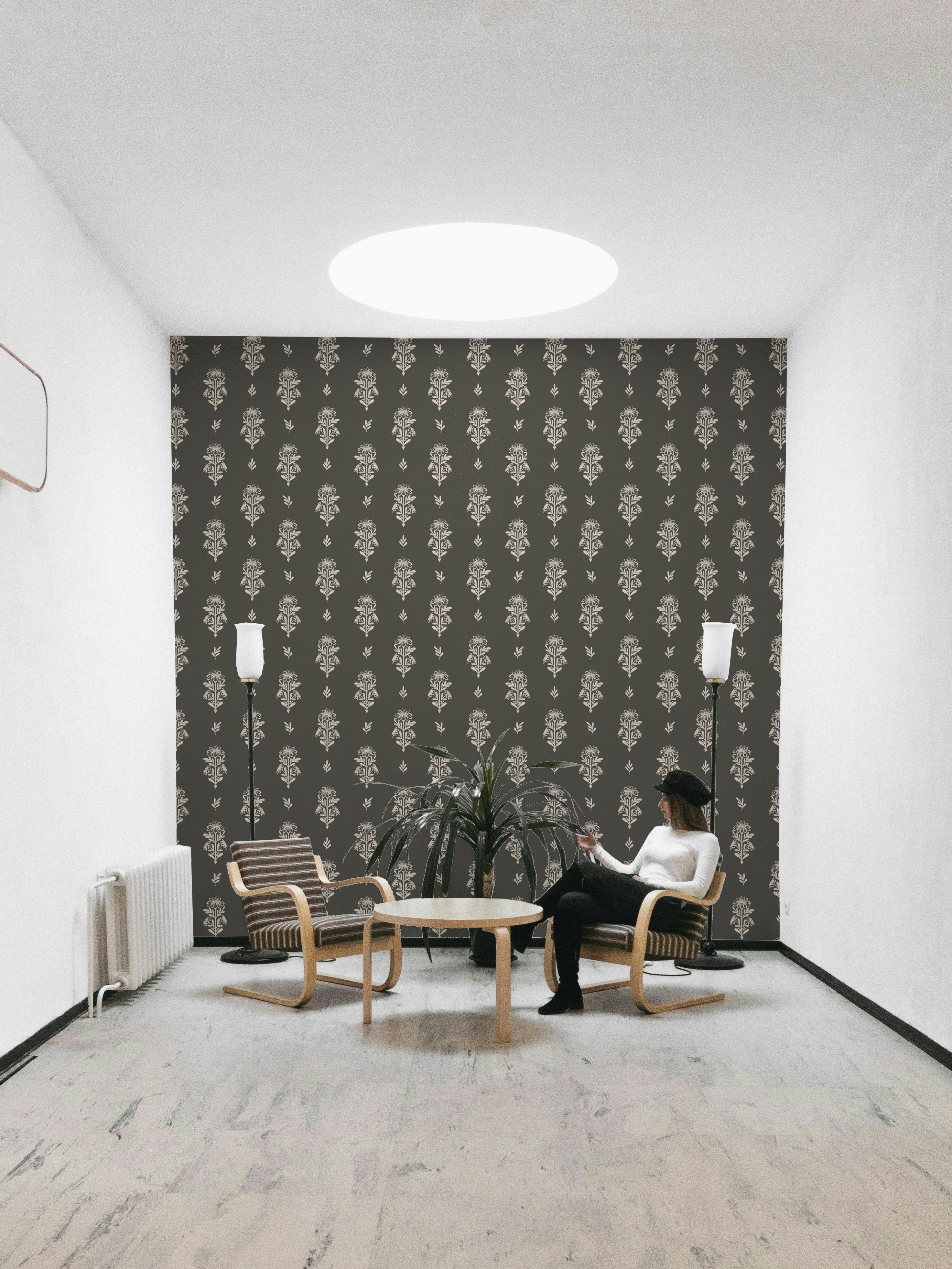 This wallpaper showcases a delicate and understated floral design, rendered in soft, chalky off-white hues against a sophisticated charcoal grey background. The hand-drawn style of the floral motifs evokes a sense of handcrafted charm and simple elegance. The repeating pattern is subtle yet captivating, creating a calming and sophisticated atmosphere. Perfect for bedrooms, living rooms, or any space where a touch of understated elegance is desired. The muted color palette and simple design make it a versatile choice that complements various interior styles, from minimalist to modern farmhouse.