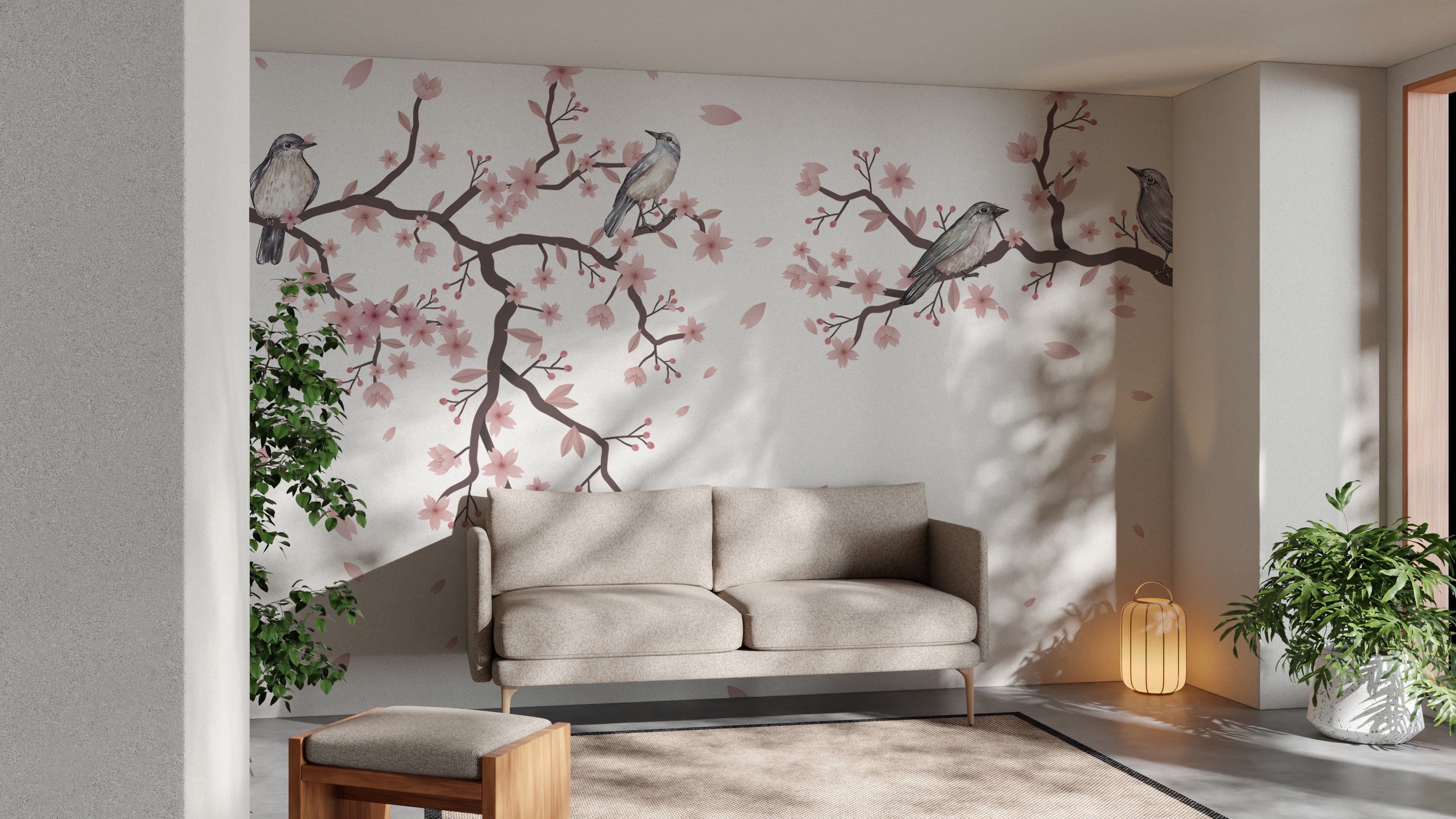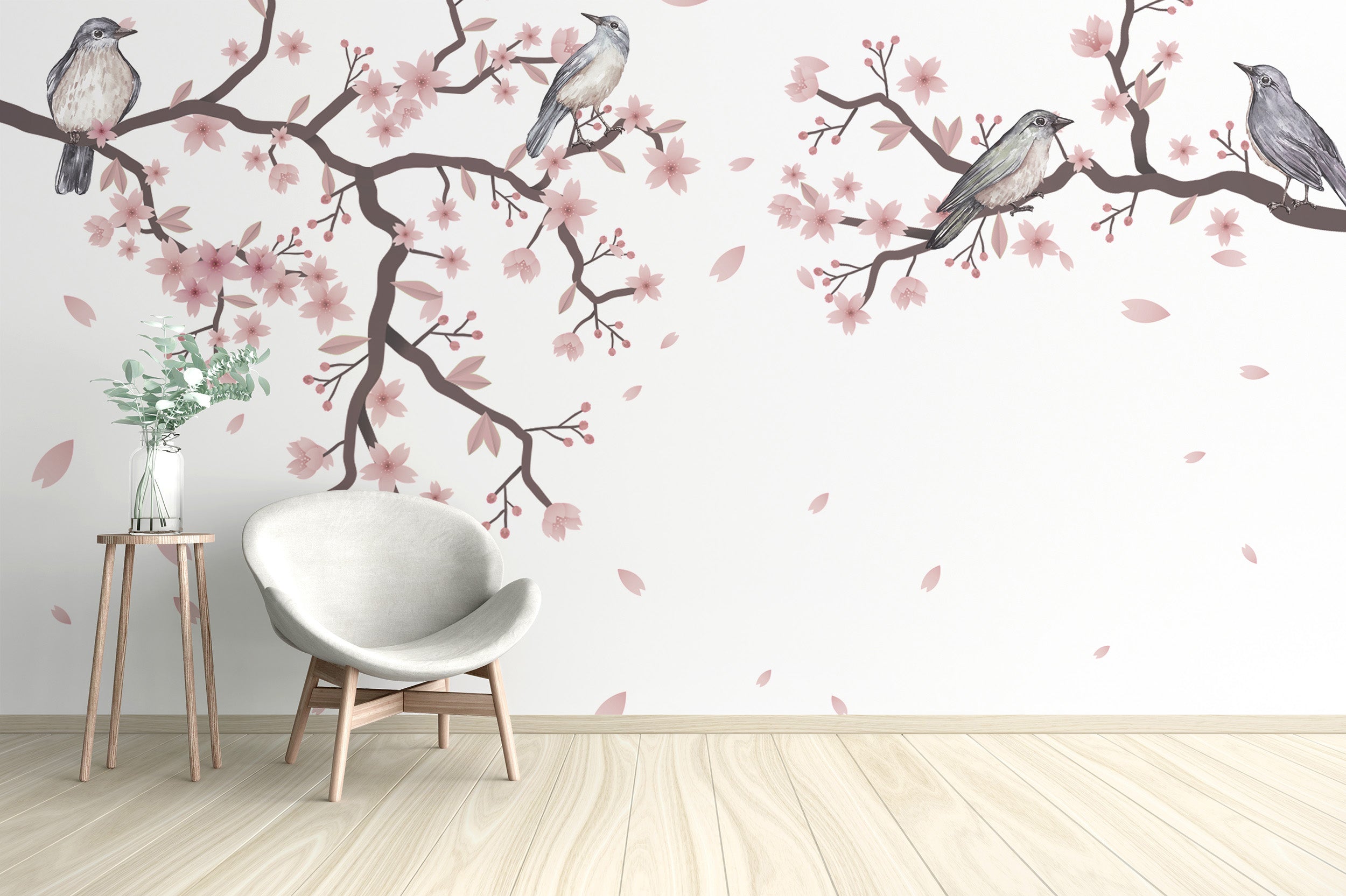 Step into a world where the gentle charm of springtime is ever-present with the cherry blossom serenade wall mural. This piece captures the ephemeral beauty of cherry blossoms in full bloom, with soft petals floating down around a congregation of serene birds. As bird wallpaper, it offers a moment of pause, a snapshot where nature's feathered creatures rest quietly on delicate branches. Imagine this cherry blossom wallpaper mural in a cozy nook or as a focal point in a minimalist room, where it adds a breath of freshness without overwhelming the senses. It's a celebration of the subtle interplay between flora and fauna, designed to create a serene backdrop that captivates and soothes in equal measure. This blossom wallpaper mural is not just a visual treat; it's a timeless whisper of spring for any wall it adorns.