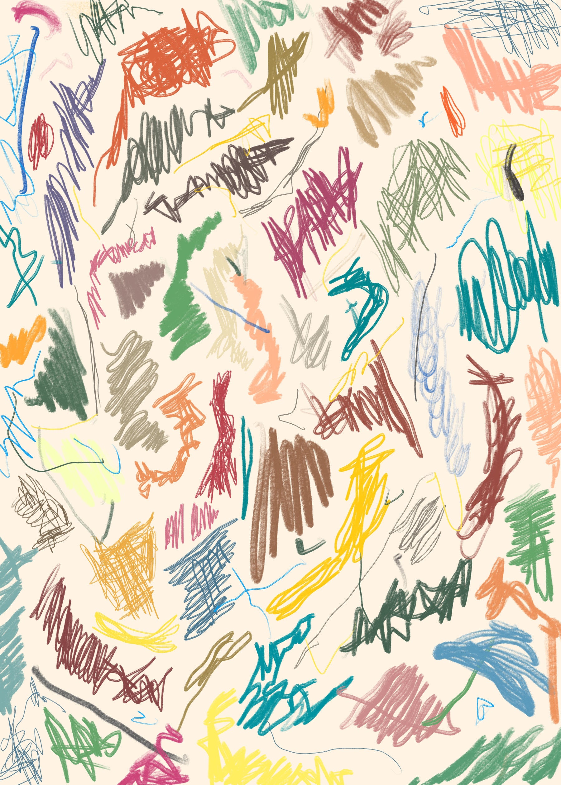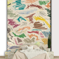 Embrace the delightful chaos of 'Cianfrusaglia,' a vibrant wallpaper design bursting with energy. A profusion of hand-drawn scribbles, lines, and shapes in a palette of warm earth tones and playful pastels dances across a creamy background. The playful, almost childlike energy of the strokes evokes a sense of joyful spontaneity. This abstract artwork is perfect for adding a touch of whimsical, artistic flair to any digital device, reflecting a mood of carefree creativity and expressive freedom. The seemingly random arrangement of marks creates an unexpectedly harmonious composition, perfect for those who appreciate a unique and expressive aesthetic.