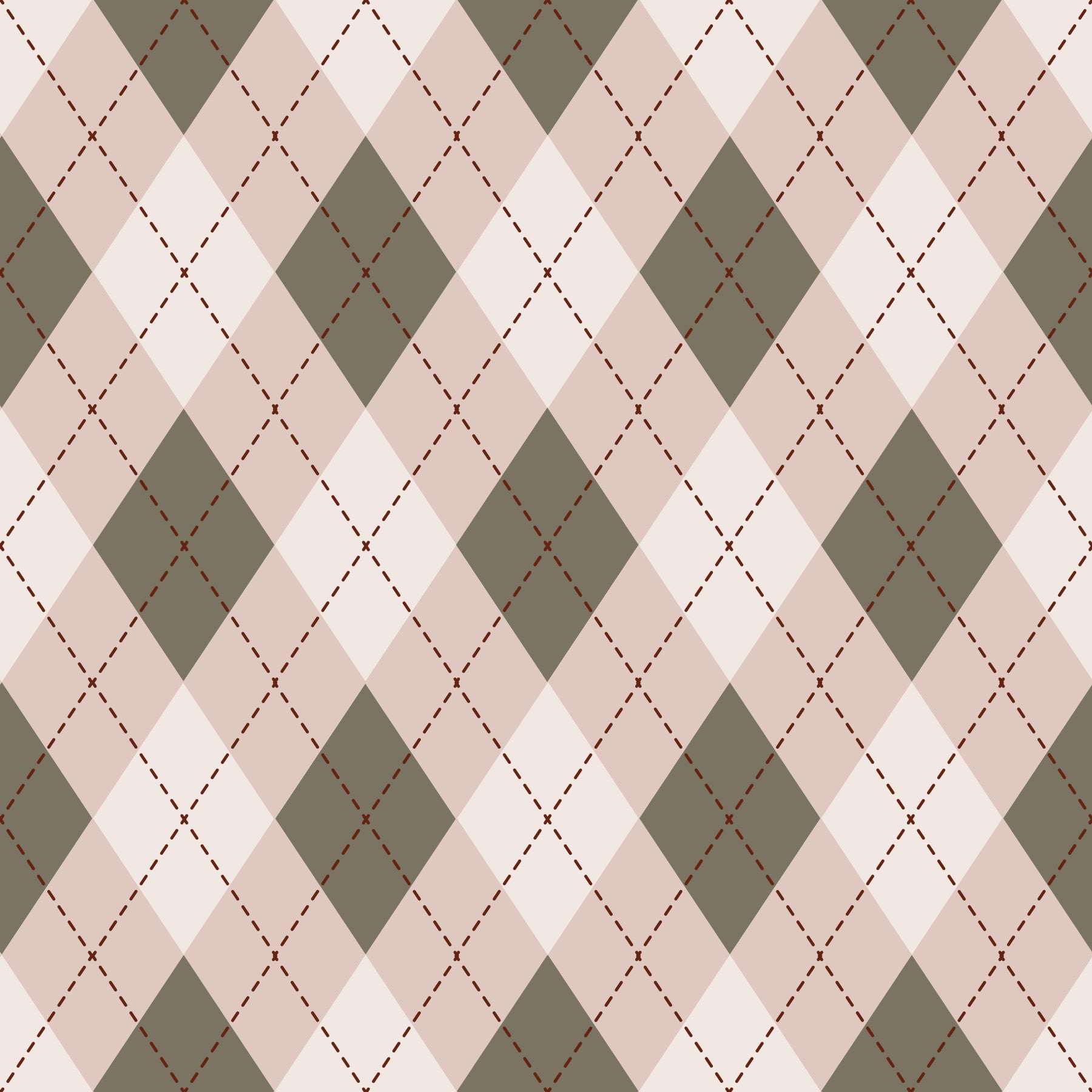 Embrace timeless elegance with our 'Classic Argyle Pattern Sage and Baby Pink' wallpaper. This design marries tradition with a gentle, contemporary color palette, creating a sophisticated yet comforting ambiance. The iconic argyle diamonds, rendered in soft sage and delicate baby pink hues, interweave seamlessly, adding a touch of understated charm to any space. Defined by subtle dashed lines in a dark brown, the pattern has a refined, almost hand-stitched appearance, hinting at quality craftsmanship. This wallpaper is the perfect choice for nurseries, bedrooms, or any room where you seek to create a calm and stylish retreat. Its muted tones and classic design make it incredibly versatile, complementing a wide range of decor styles from traditional to modern minimalist. Infuse your walls with a touch of enduring beauty and tranquil sophistication with this exquisitely designed argyle pattern.
