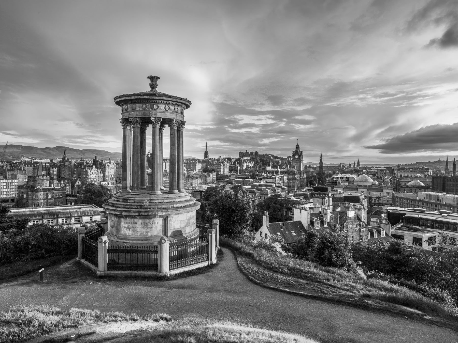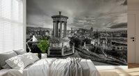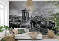 Edinburgh cityscape from Calton Hill, Scotland. Immerse your space in the timeless elegance of 'Classical City Charm.' This striking wall décor captures a majestic cityscape in monochrome, dominated by a neoclassical monument that anchors the composition. A sprawling urban landscape unfolds, revealing architectural details and a sense of history etched into every building. The sky, alive with cloud formations, adds depth and drama, creating a captivating backdrop for the cityscape. The monochrome palette highlights the intricate details of the monument and the surrounding city, adding to the overall grandeur and sophistication. Elevate any room with this piece, which evokes a sense of historical depth, architectural beauty, and classic charm, transforming your walls into a window to the past.