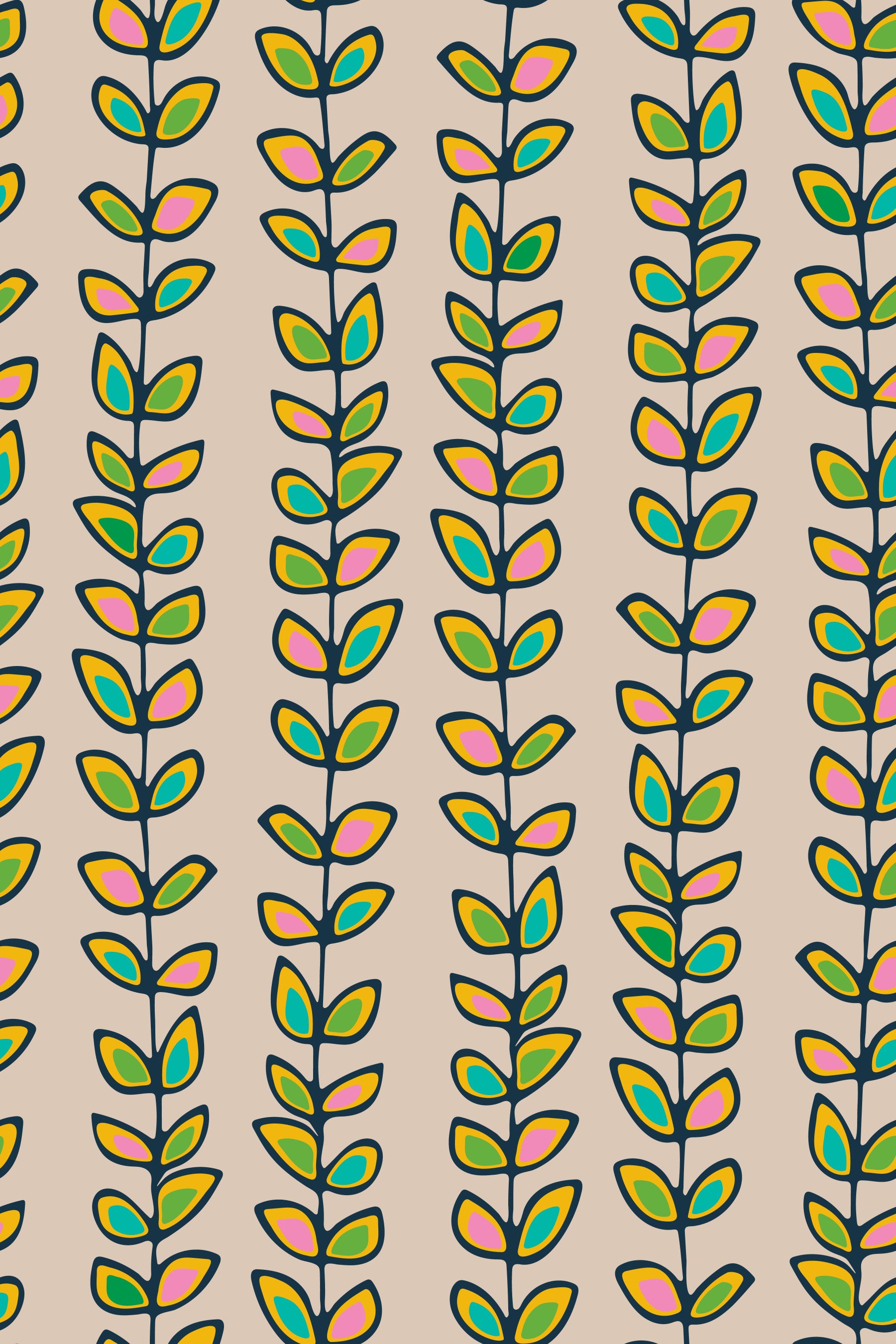 Striped vine motifs with green, yellow, and pink leaves creating a playful retro wallpaper on an off-white background.