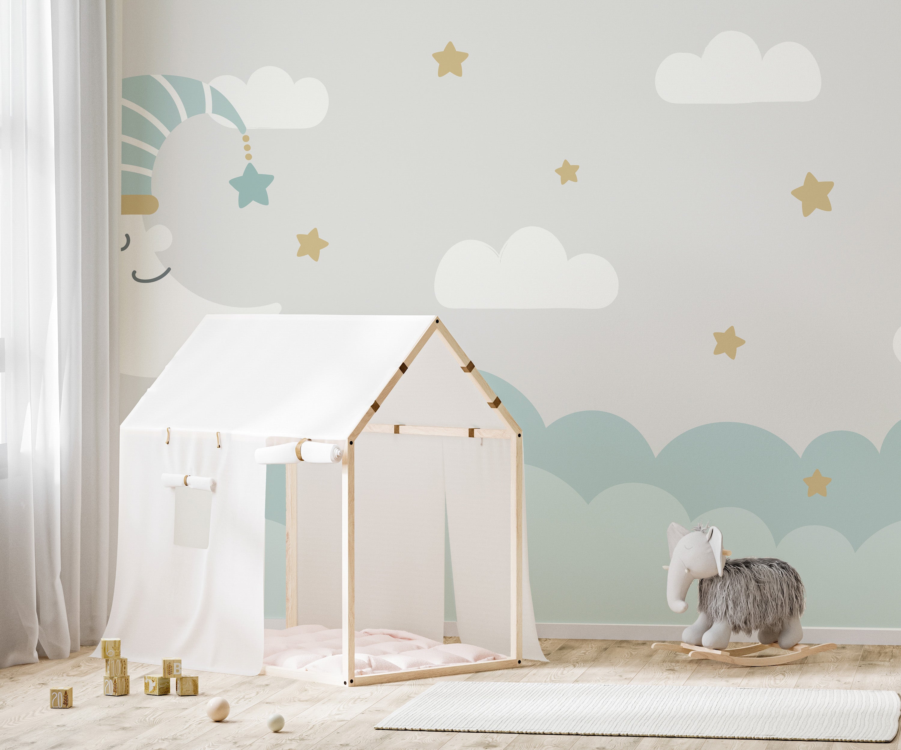 Elevate your child's bedroom into a celestial sanctuary with our enchanting clouds and moon wallpaper murals from Giffywalls. Imagine the soft glow of a silvery moon amidst a dance of fluffy white clouds, all set against a tranquil gray sky—a scene that promises to spark imagination and wonder in every moment spent within its embrace.