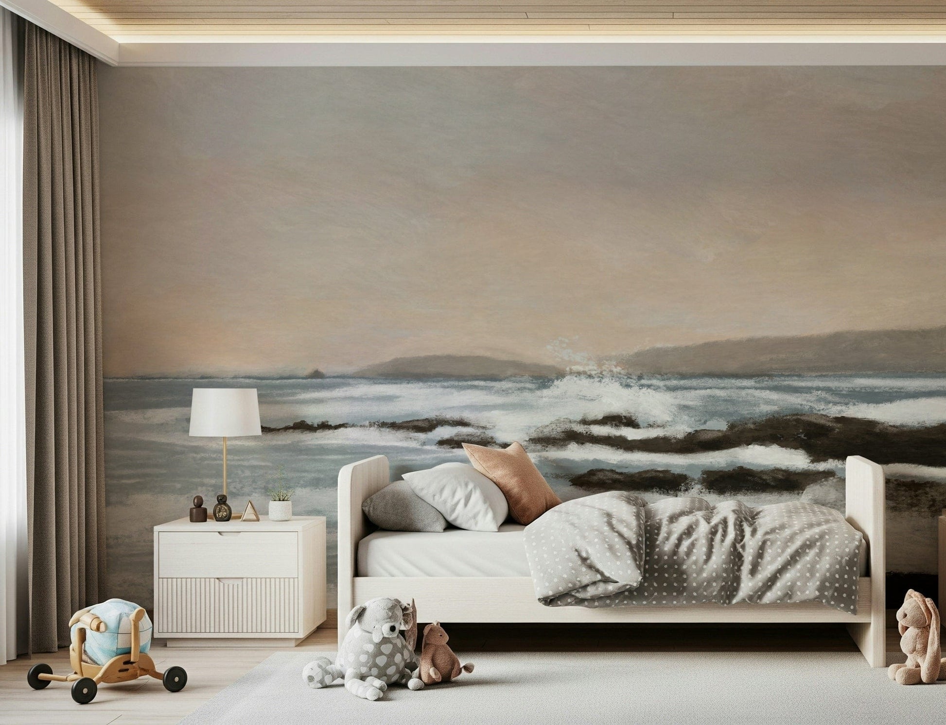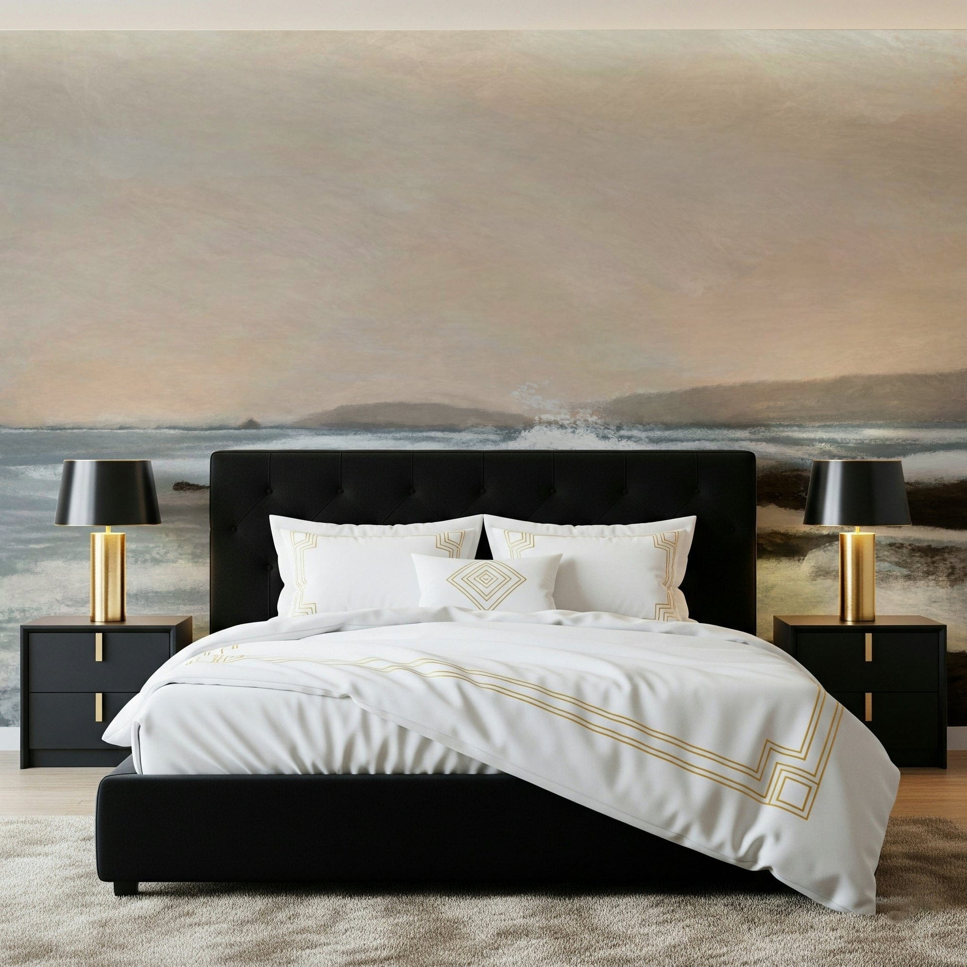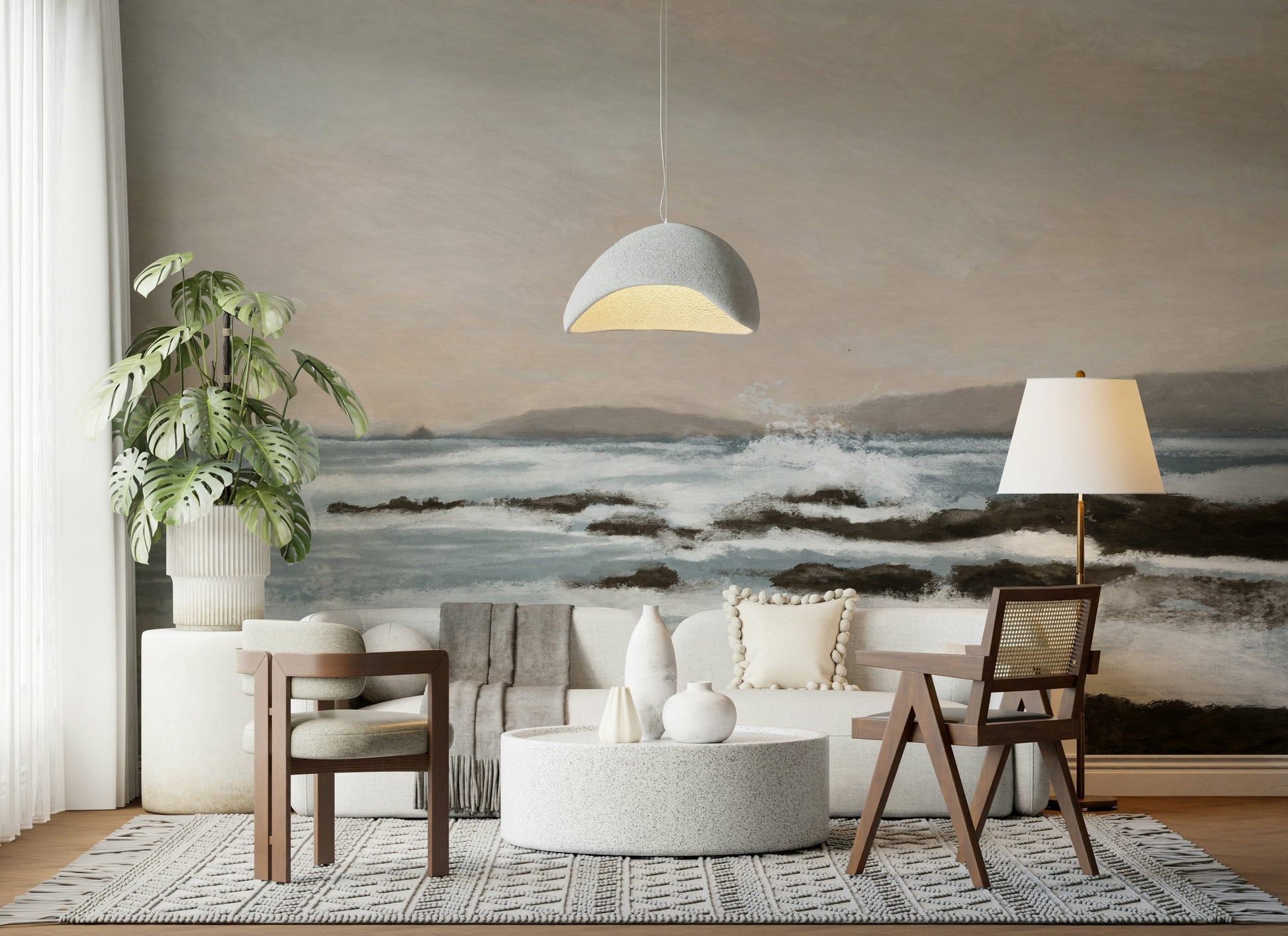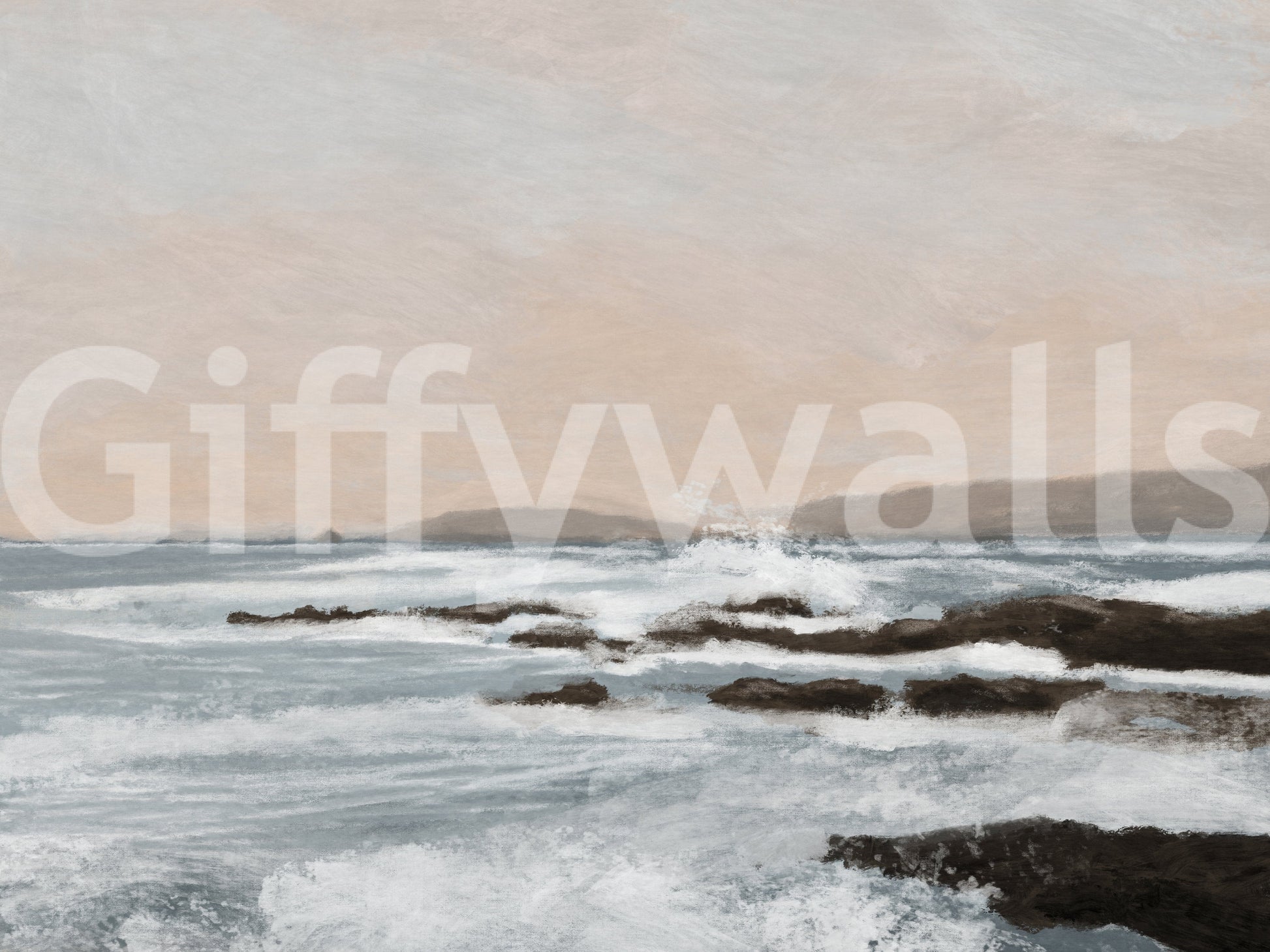Invite the ocean's calm into your space with this peaceful wallpaper. The gentle brushstrokes capture a serene coastal scene, featuring soft blues, creamy whites, and earthy browns. This wallpaper for walls evokes a sense of tranquility. It works beautifully in a living room, bedroom, or office, adding a touch of nature-inspired art. The subtle colors and textures make it a versatile choice that complements various interior styles, from modern to rustic.