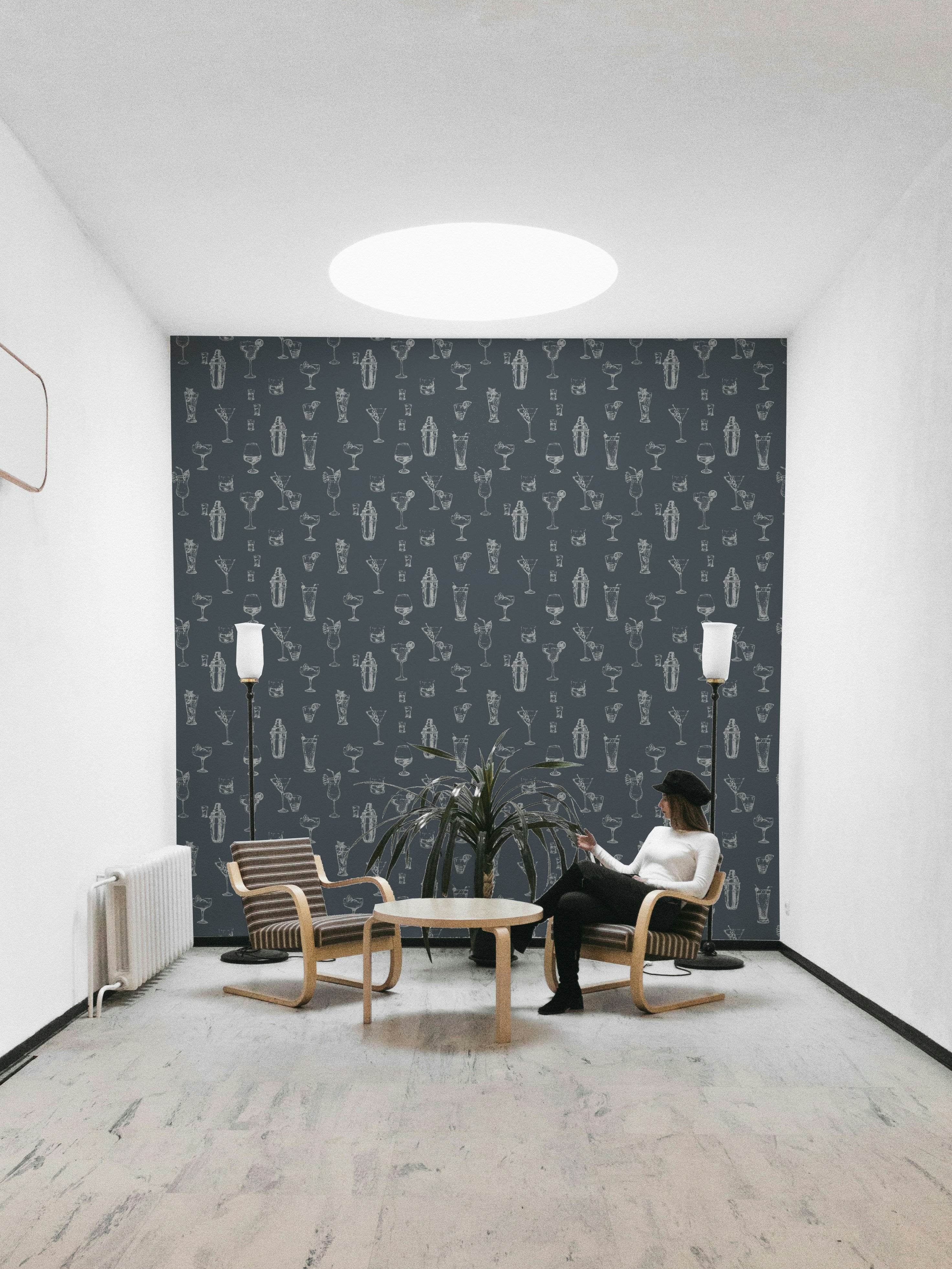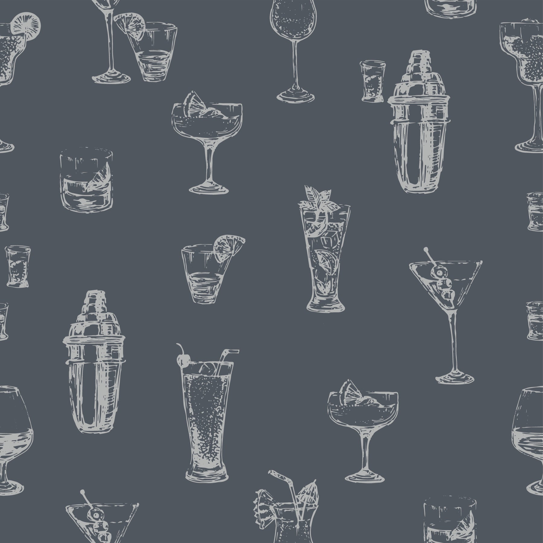 This sophisticated wallpaper features a charming hand-drawn illustration of various cocktails and bar tools. The repeating pattern of glasses, shakers, and garnishes creates a stylish and elegant ambiance. The muted silver-grey on a dark grey background offers a timeless feel, perfect for a bar, home office, or any space that appreciates a touch of classic sophistication. The intricate details of each drink add visual interest, and the overall design is effortlessly chic, perfect for adding a unique and tasteful accent to your walls.