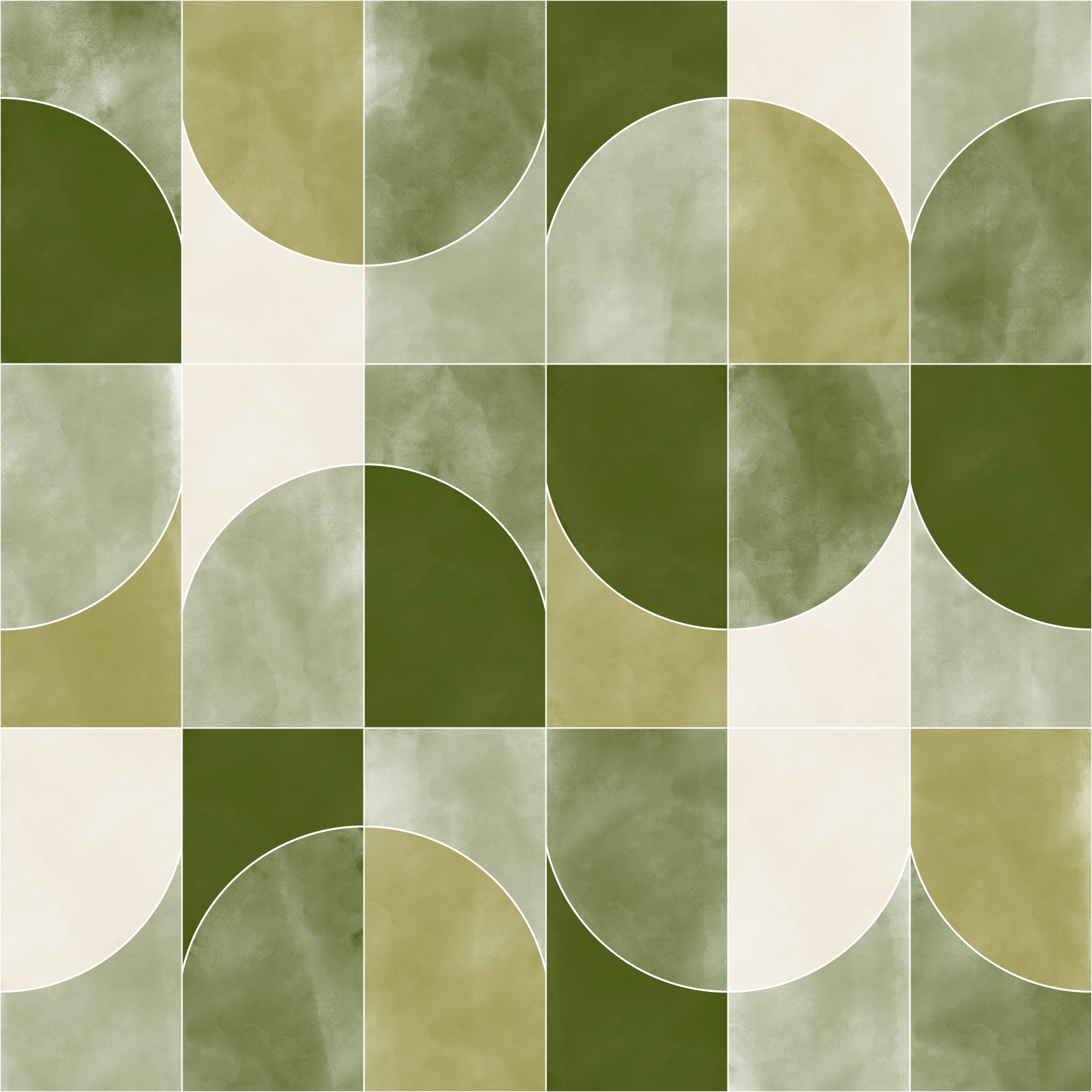 Immerse yourself in the tranquil embrace of COLOR WASHED GEO TILES MUSKY a wallpaper that marries geometric precision with the soft, diffused beauty of watercolor textures. This design features a captivating arrangement of squares and semi-circles, creating a modern tile effect that's both visually stimulating and subtly grounding. The palette revolves around muted greens and earthy creams, lending a 'musky' depth and sophisticated warmth to any space. Each tile showcases a delicate color wash, imparting an organic, hand-painted feel that softens the sharp lines of the geometry. Perfect for creating a serene and stylish atmosphere, this wallpaper evokes a sense of calm sophistication, bringing a touch of refined elegance to your walls. Elevate your interiors with this unique blend of artistry and contemporary design.