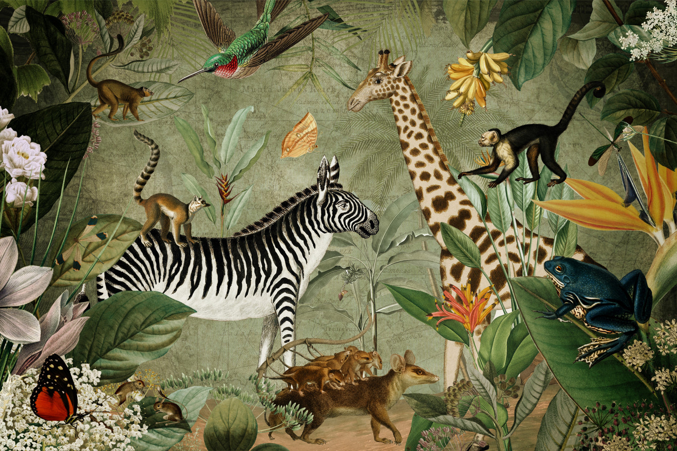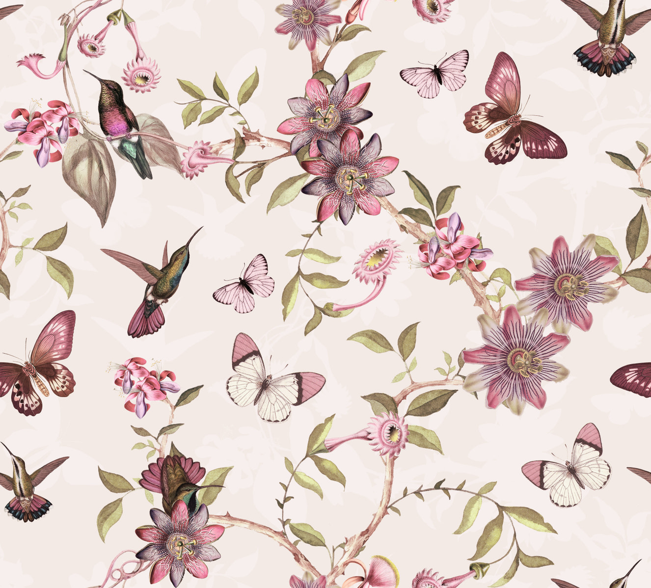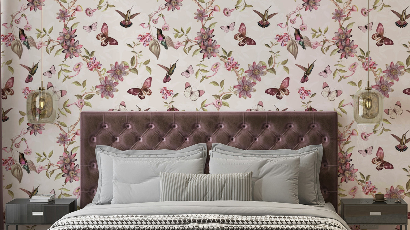 Nature-inspired wallpaper mural with bright butterfly patterns.