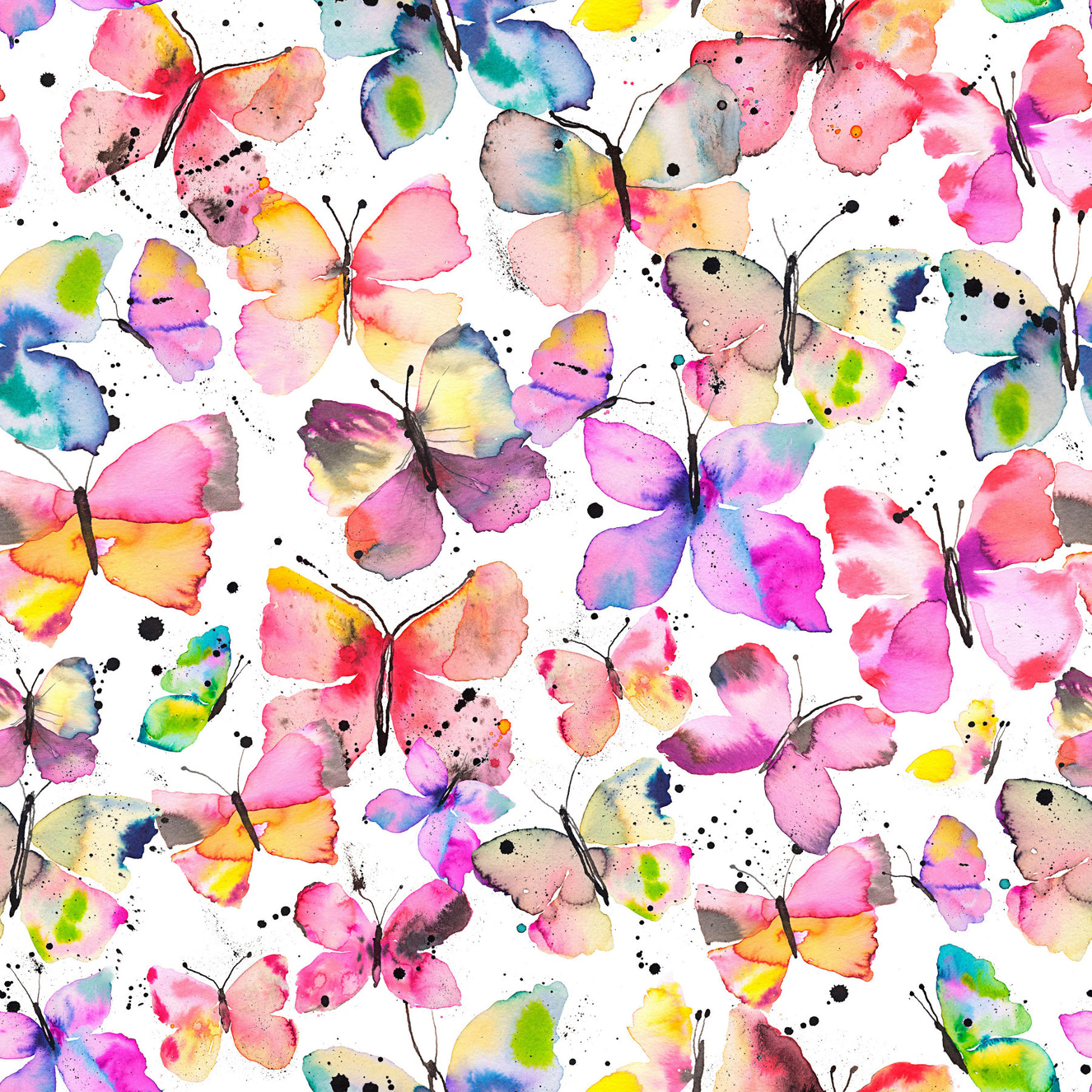 Whimsical butterfly pattern wallpaper with bold, colorful designs.