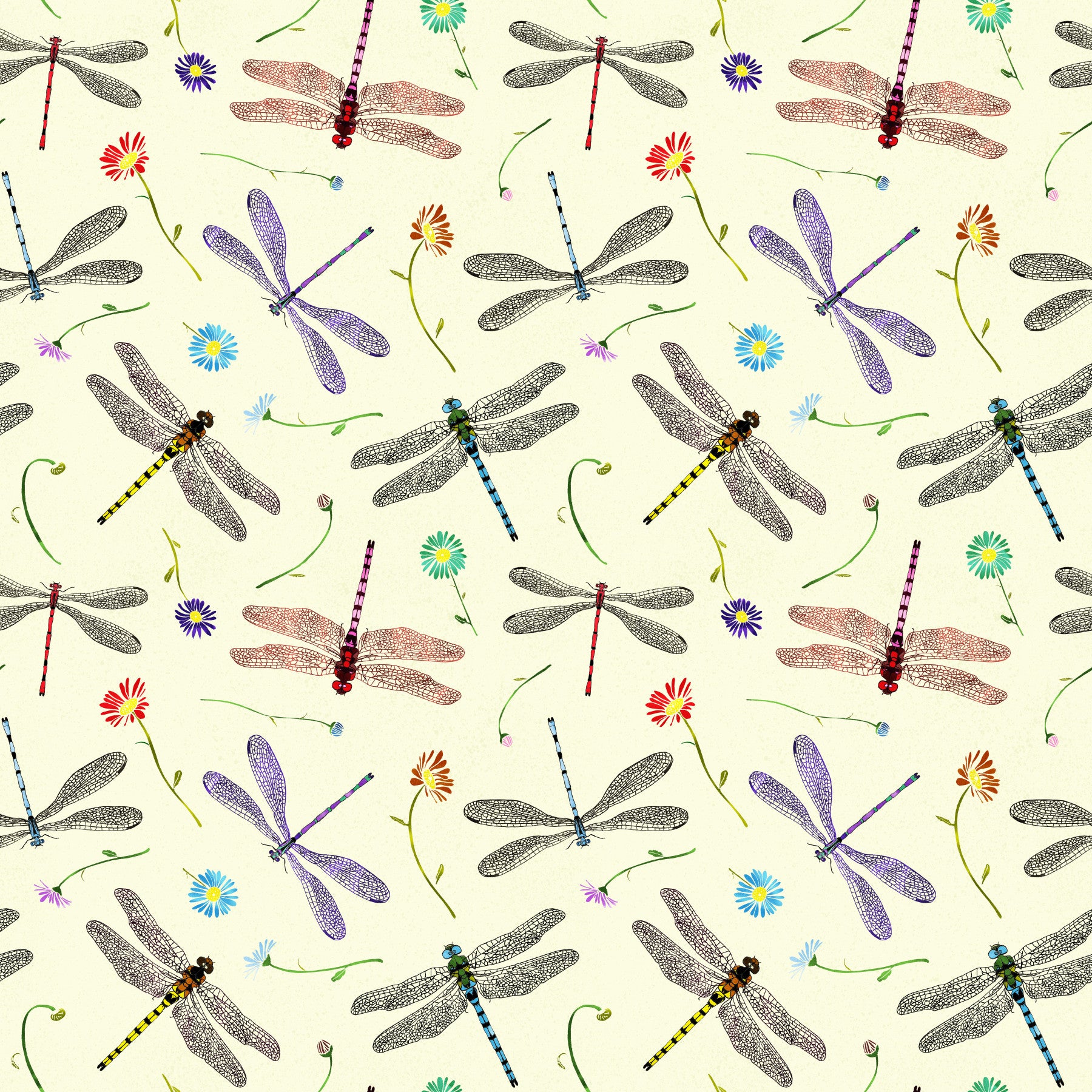 A vibrant and whimsical wallpaper featuring a delightful array of colorful dragonflies and damselflies delicately poised amidst a scattering of wildflowers. Each insect boasts unique and eye-catching color combinations, ranging from rich reds and purples to bright blues and yellows, their intricate wing details sharply rendered against a soft, creamy background. The playful pattern creates a cheerful and energetic mood, perfect for adding a touch of nature's artistry to any digital device. This design is a celebration of delicate beauty and the joys of springtime, offering a refreshing and stylish visual experience.