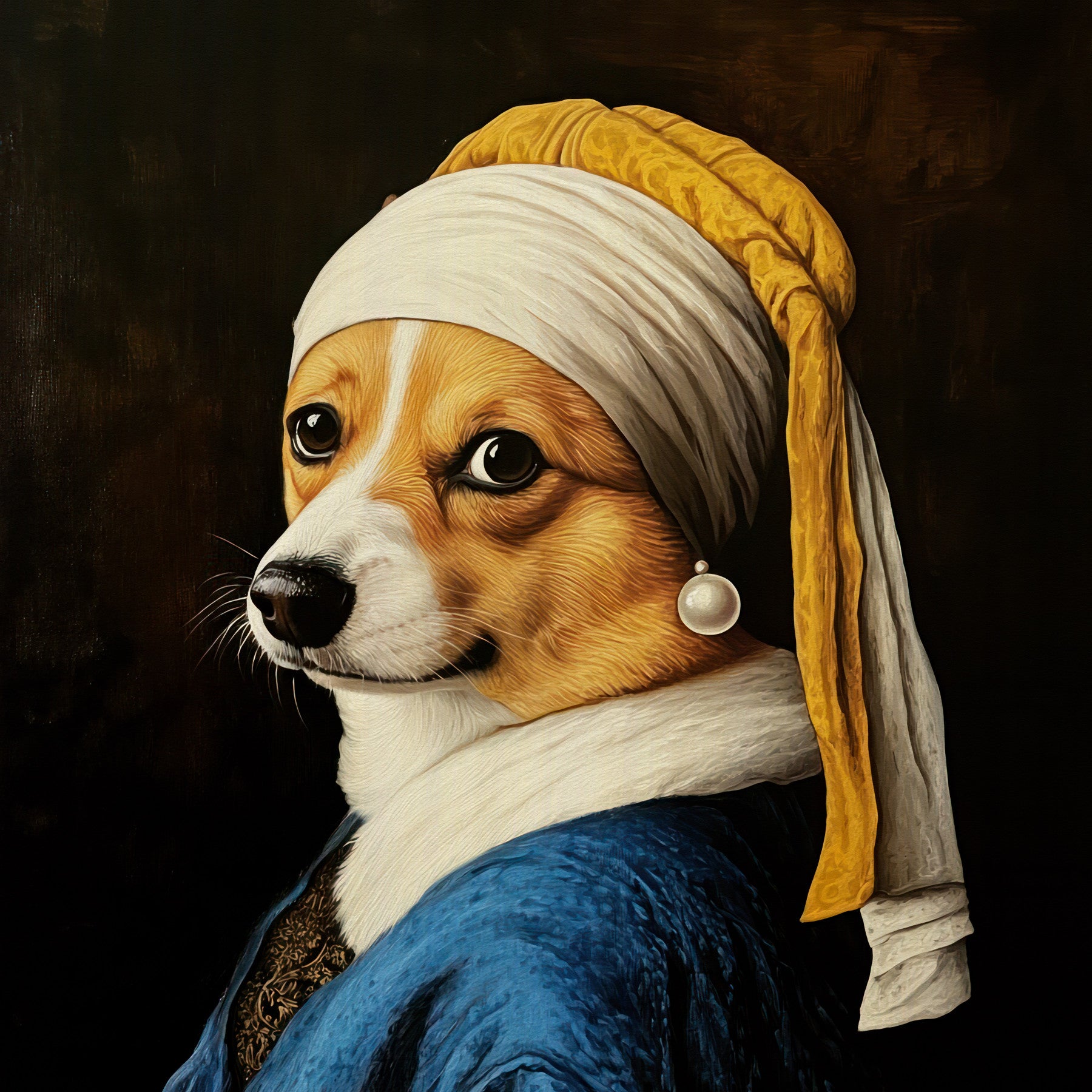 A charming and humorous take on a timeless classic, this portrait reimagines the famous girl with the pearl earring as an adorable corgi. Dressed in a flowing blue robe and wearing the iconic pearl, the corgi’s soulful eyes and dignified pose blend Renaissance elegance with playful whimsy. The deep, dark background enhances the richness of detail, making it a perfect statement piece for eclectic homes, dog lovers, and art enthusiasts alike. Ideal for living rooms, creative studios, or conversation-starting wall decor.