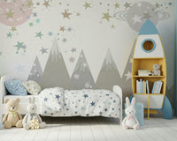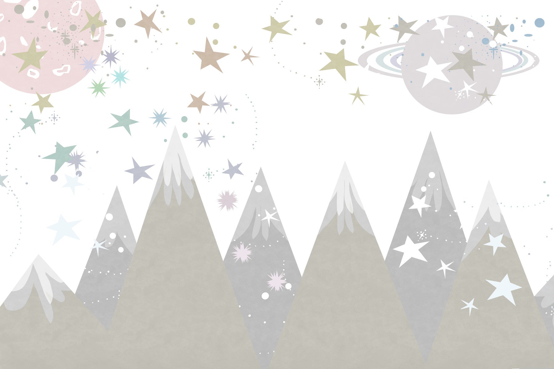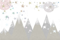 Invite wonder with this celestial-themed wallpaper for walls. Soft pastel planets and twinkling stars float above a serene mountain range. Neutral grays and blush tones create a peaceful mood, perfect for a nursery or bedroom. The playful design encourages imagination and adds a touch of magic to any child's space. It also works well in a playroom, fostering a calm and creative environment.