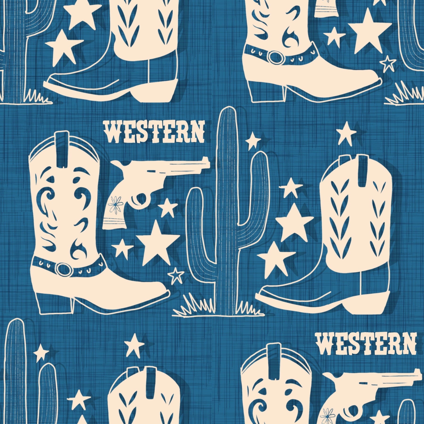 Country Western wallpaper featuring illustrated boots, stars, and cactuses on a warm tan backdrop.