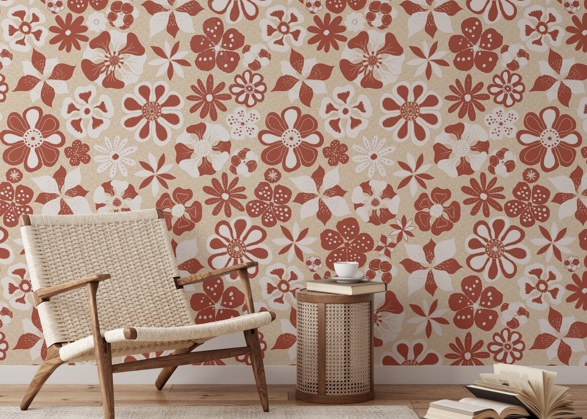 'Earthy Floral Tapestry' offers a sophisticated take on botanical wallpaper. Rich terracotta and creamy off-white flowers intertwine against a lightly textured beige background, creating a calming and elegant aesthetic. The detailed hand-drawn style adds a layer of artistry, while the seamless repeat ensures a cohesive and luxurious feel. Perfect for creating a serene atmosphere in living rooms, bedrooms, or even hallways, this wallpaper brings nature's elegance into your home.