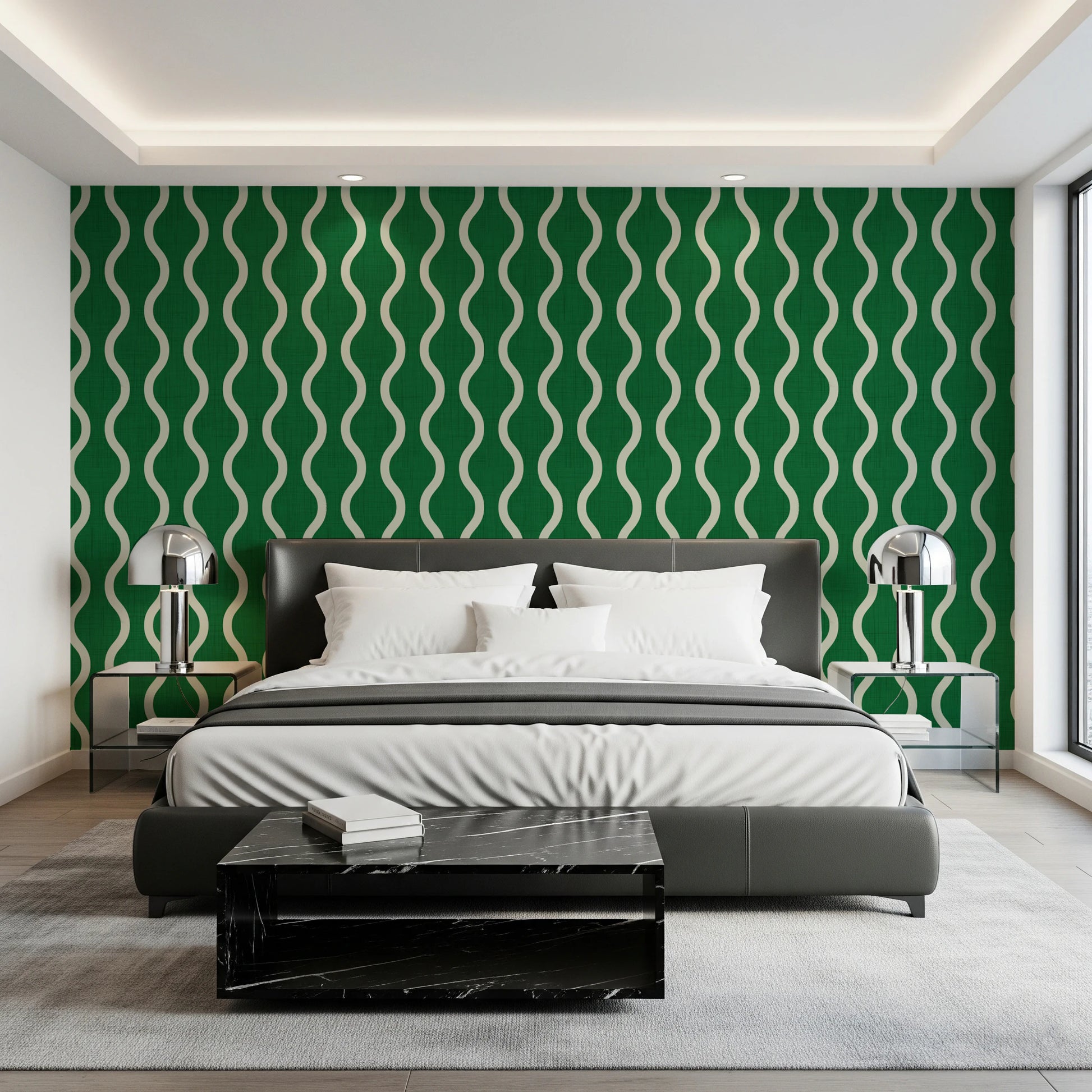 Embrace the warmth of Scandinavian design with our 'Cozy Scandi Folk' wall covering. This captivating pattern features gentle, undulating stripes in a soft, natural hue, set against a grounding forest green textured background. The handcrafted aesthetic evokes the simplicity and comfort of folk art, bringing a sense of calm and understated elegance to any room. The wavy stripes add a touch of playful movement, creating a visually engaging surface that's both comforting and stylish. Infuse your space with a touch of hygge and natural beauty with this inviting design that complements a variety of décor styles from modern minimalist to rustic charm. Add a touch of refined nature to your interiors.