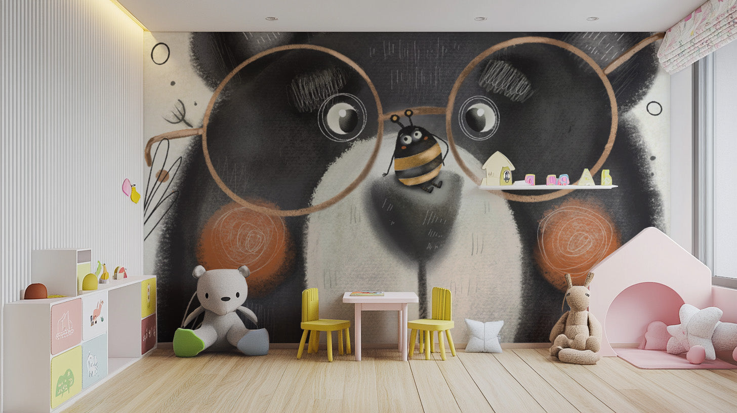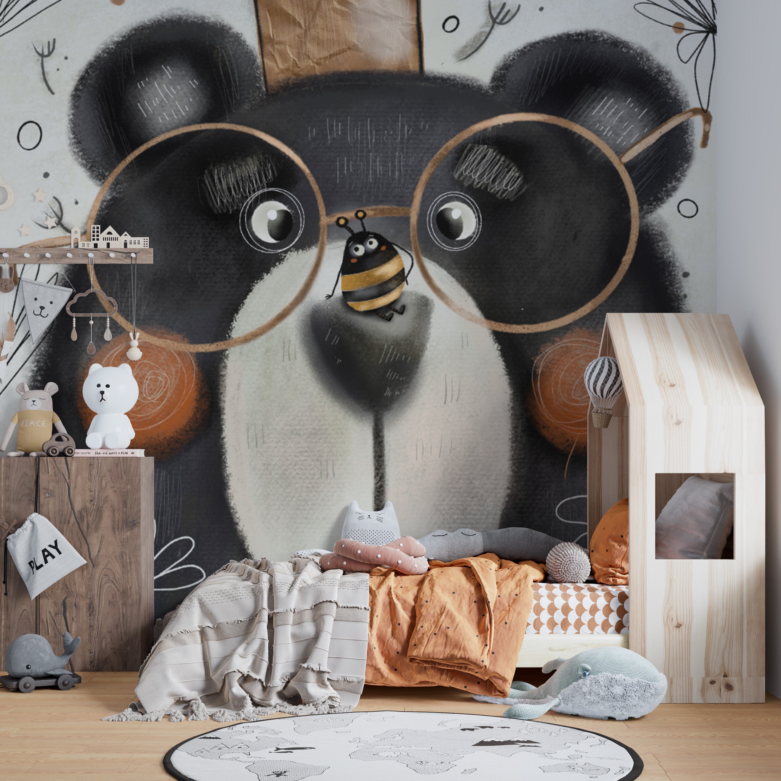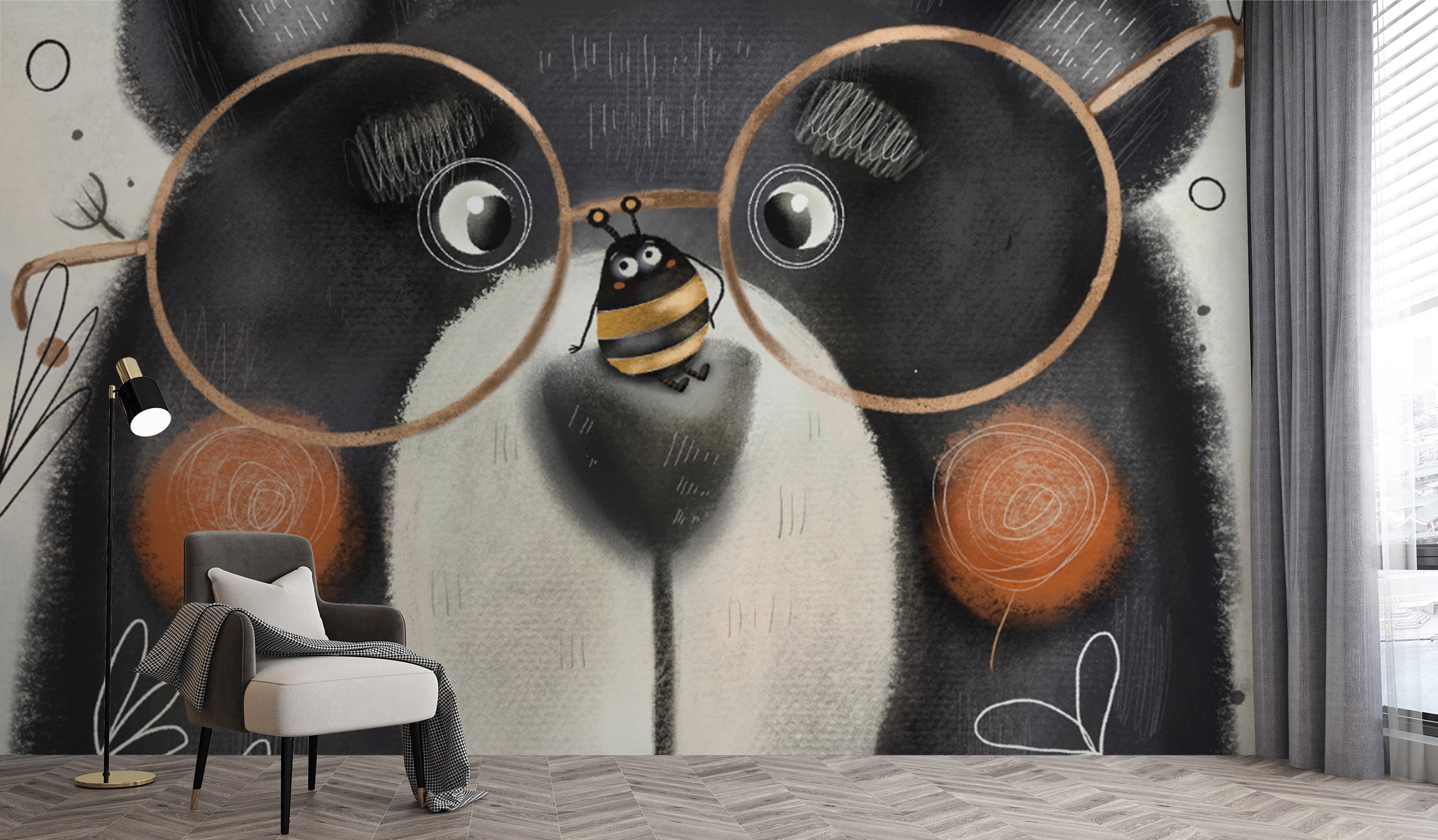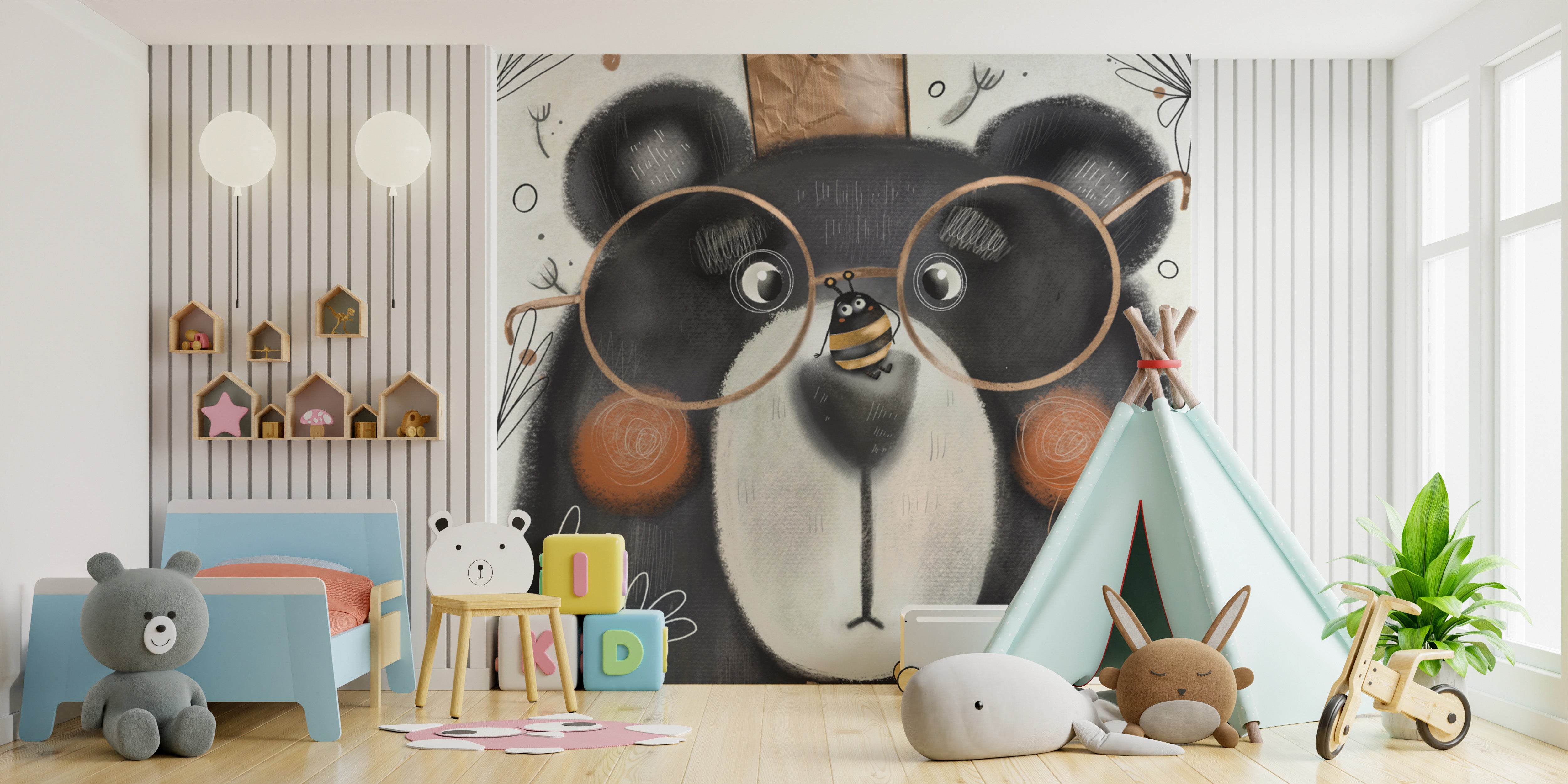 A creative bear-face wallpaper mural brings a playful, funny ambiance to your house. It gives a bear with oversized glasses, a crown, and a playful bee on its nose in this wallpaper mural. Your room will have fun and become lighter with these murals since they can add a lighthearted atmosphere to the most glamorous spaces. You can use them for a little girl's bedroom decoration or a cheerful living room. Shop now and get this unique, cute mural sent free shipping to your door, adding a creative touch to your home!