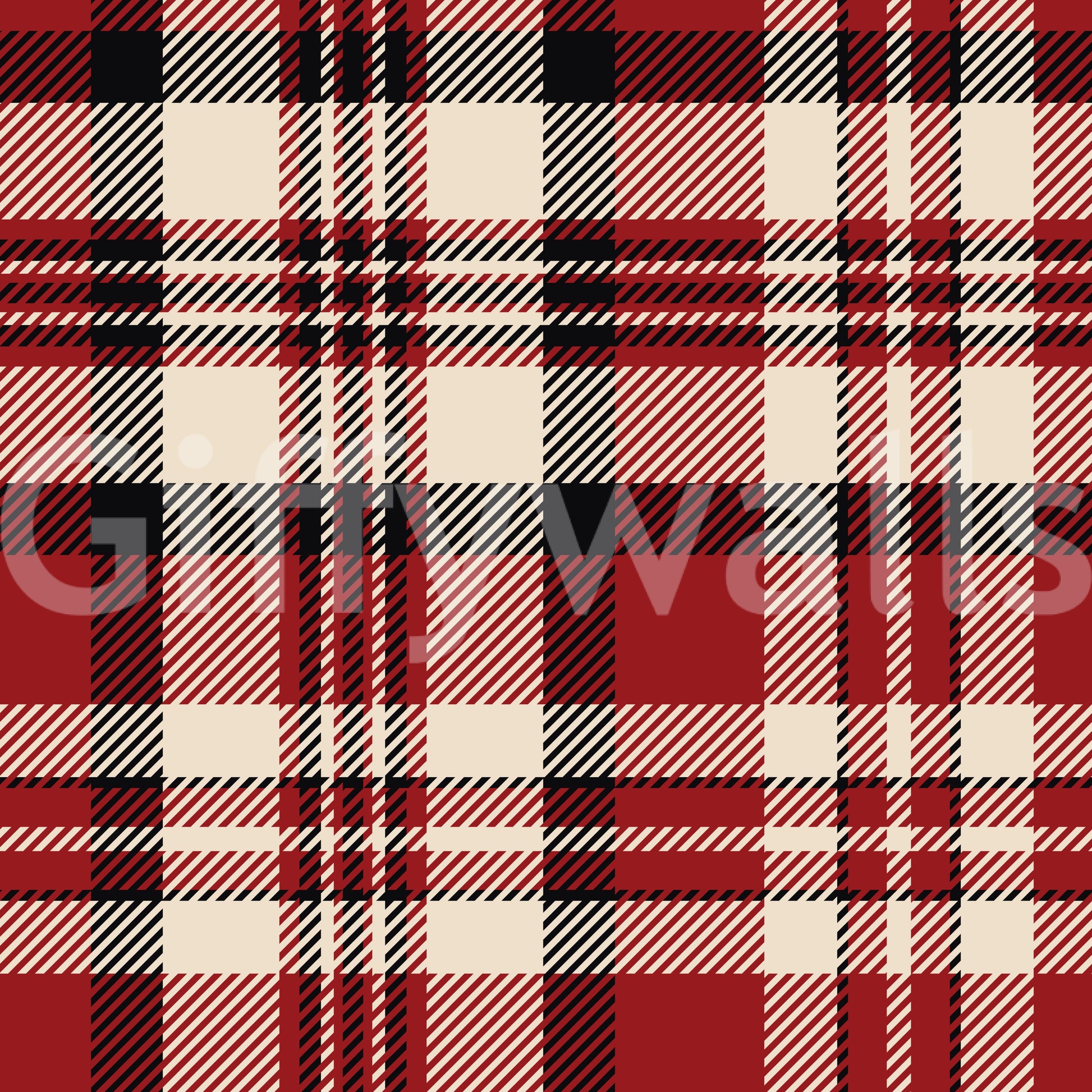 Bring a sense of cozy charm to your space with this traditional plaid design. Bold crimson stripes intersect with cream and black lines, creating a balanced pattern. The wallpaper for walls offers a timeless aesthetic. It suits a living room, study, or bedroom, adding warmth and a touch of classic style. Let this geometric motif enrich interiors with its comforting pattern.