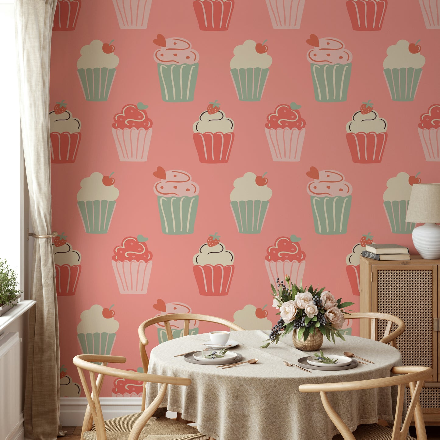 Step right up to a whimsical world of treats with this enchanting cupcake wallpaper. A delightful array of colorful cupcakes creates a playful and inviting design. The soft pastel palette and charming details like cherries, strawberries, and hearts bring a touch of sweetness to any space. This wallpaper is perfect for adding a dash of fun to a kitchen, dining room, or children's room. Let your imagination run wild and transform your space into a delightful confectionary dream.