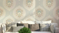 This wallpaper design features a captivating interplay of curved lines and delicate floral motifs. The flowing lines create a sense of movement and rhythm, while the soft-hued flowers add a touch of organic charm. The neutral color palette, primarily consisting of beige, soft blue-gray, and muted orange, exudes a tranquil and calming ambiance. This design is incredibly versatile, making it a perfect choice for various spaces such as bedrooms, living rooms, or hallways. The subtle yet intricate patterns add a touch of understated elegance, creating a soothing and sophisticated environment that promotes relaxation and peace. Its versatility allows for seamless integration into modern or traditional interior design schemes.