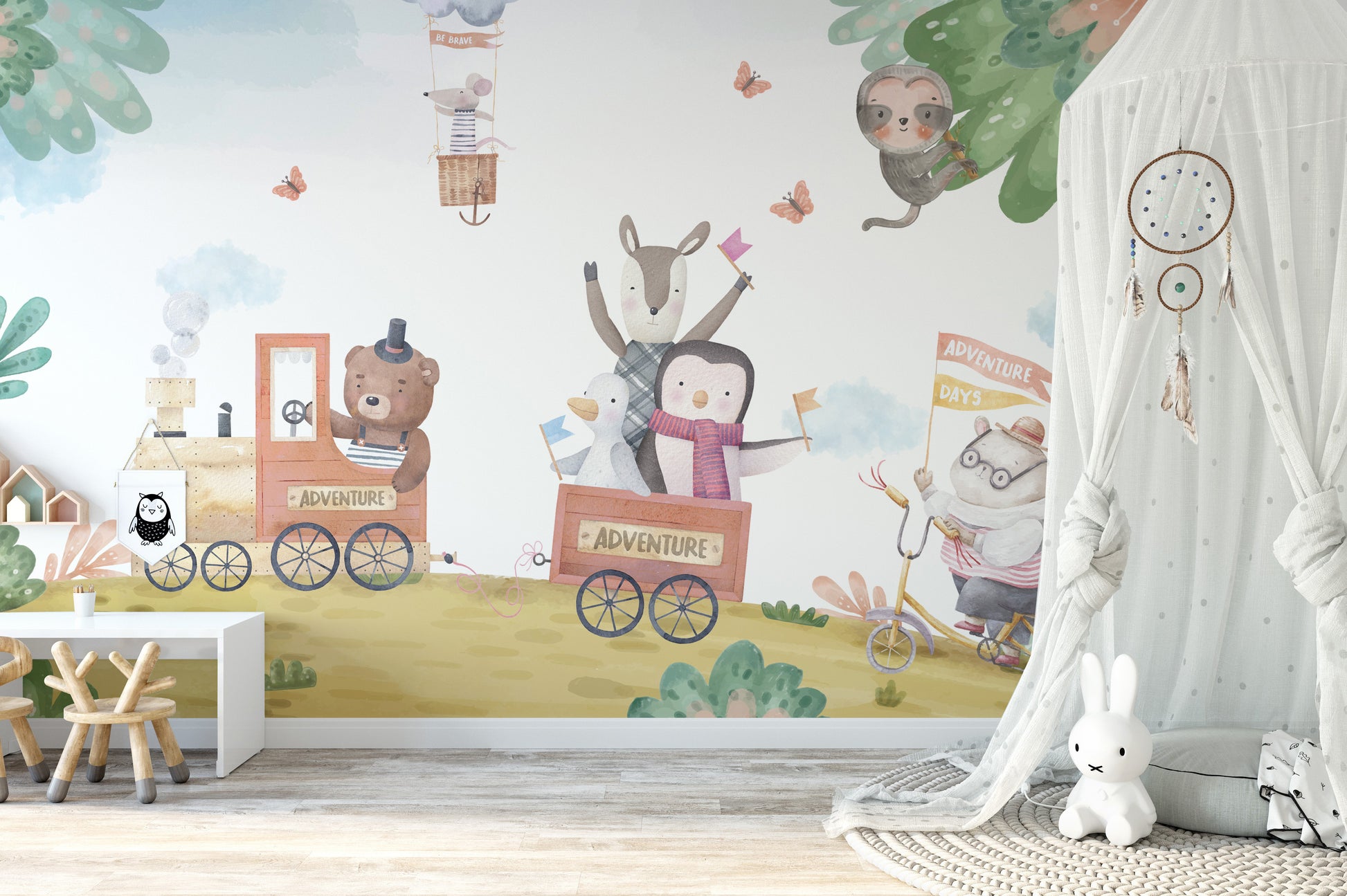 Charming wallpaper design featuring a train of animated animals in a countryside setting.