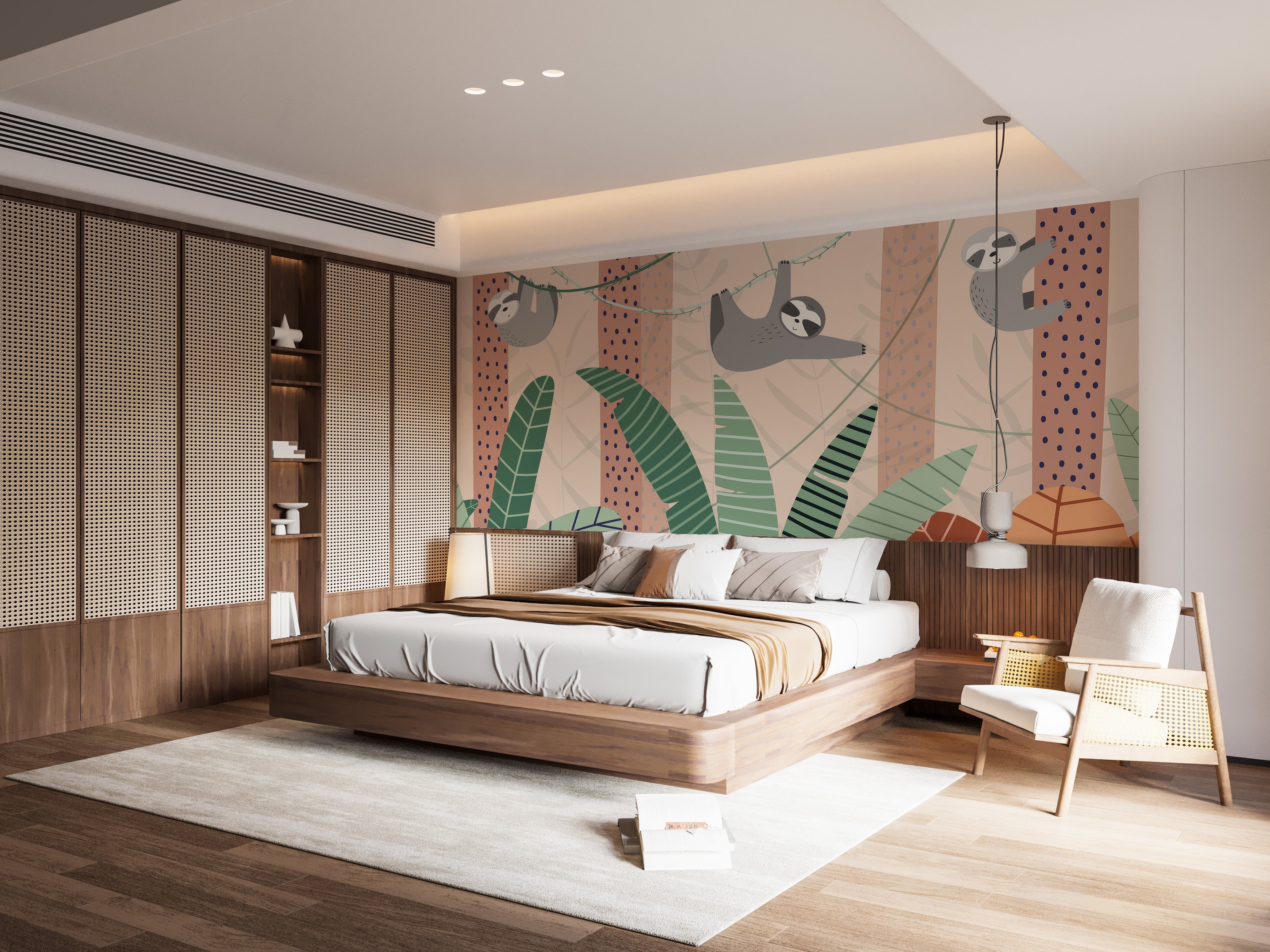 Let this charming cute cartoon sloth mural invite a burst of playfulness into any child's bedroom or play area. Illustrated with sleepy sloths leisurely lounging among vibrant trees, it’s a whimsical nod to the joys of imagination and leisurely play. Perfectly suited as kids room wallpaper, this enchanting scene captures the spirit of adventure and the sweetness of nature’s slowpokes, offering a delightful visual treat that sparks young imaginations. Crafted with an eye for color and a heart for storytelling, each sloth’s personality gently enlivens a room, turning a simple wall into a storybook forest where playful fantasies come to life. It's not just a backdrop it's an invitation to daydream and play beneath the treetops.