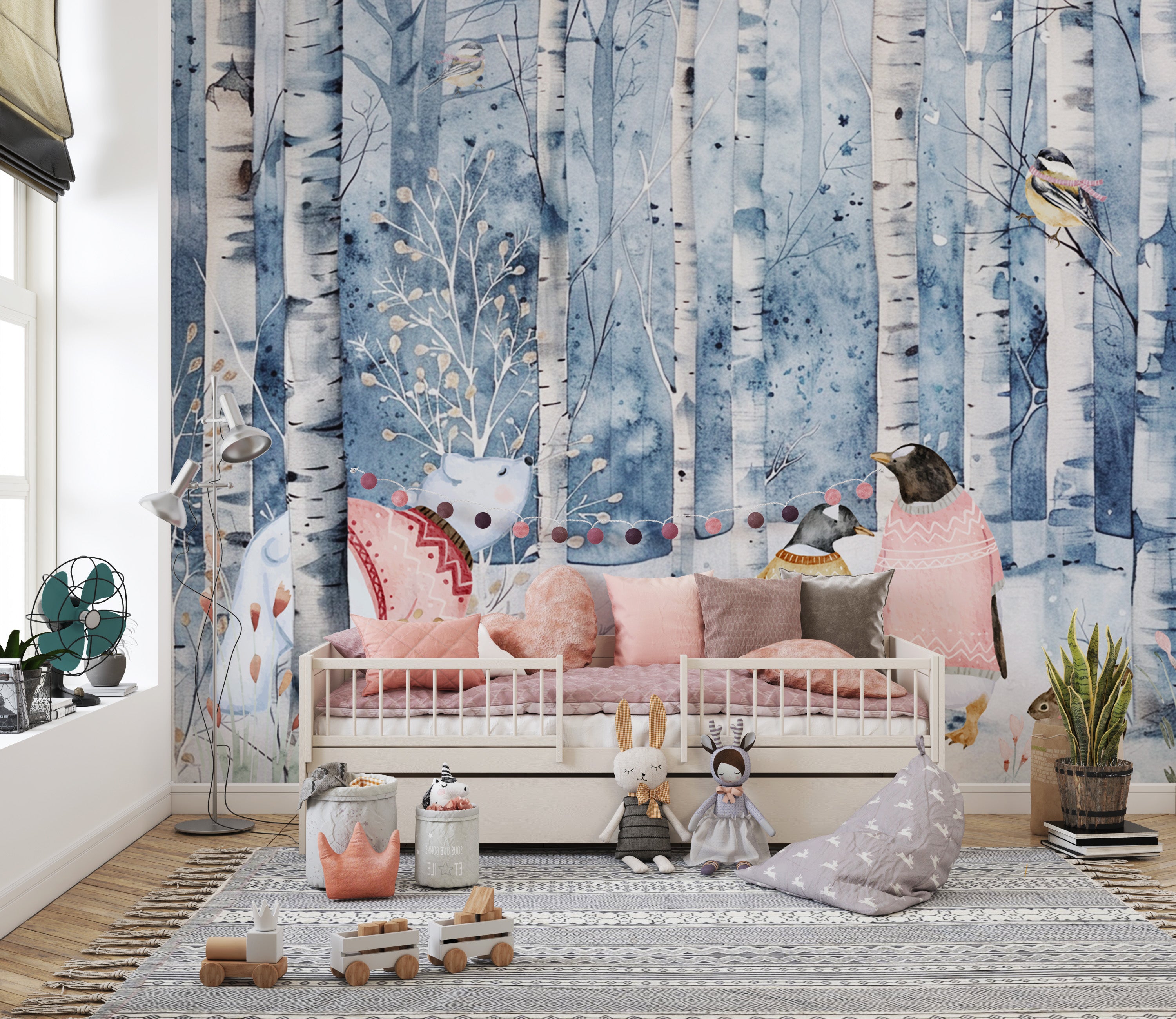 Create a cozy winter retreat with cute woodland animal wallpaper. This enchanting design features a snowy birch tree forest wallpaper with adorable penguins, a polar bear, and a squirrel in warm sweaters. Soft watercolor tones touch bedrooms, nurseries, and play areas gently. The winter woodland wallpaper blends seamlessly with modern and Scandinavian interiors. Crafted for durability, the premium print ensures lasting charm. The whimsical animal forest wallpaper makes any space feel warm and inviting. Enjoy the beauty of nature indoors with this hand-painted winter wallpaper, adding a touch of seasonal charm to walls all year round.