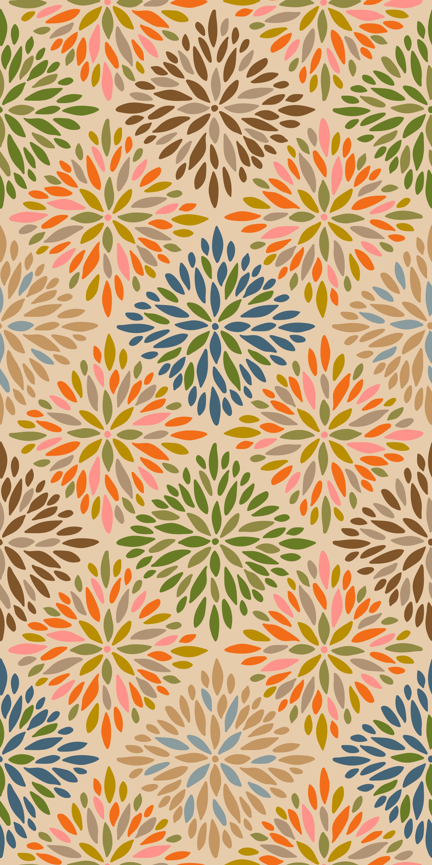 Embrace the warmth of the desert with Dahlia Diamonds a bohemian floral damask wallpaper that exudes earthy elegance. This design features stylized dahlia blossoms arranged in a mesmerizing diamond tile pattern. The color palette draws inspiration from sun-baked landscapes, showcasing rich browns, olive greens, burnt oranges, subtle blues and warm neutrals. These hues create a harmonious and inviting atmosphere, reminiscent of handcrafted textiles and natural dyes. The gorgeous flowers in a diamond layout provides a sense of both structure and organic flow, perfect for adding a touch of bohemian charm and earthy sophistication to any space, "Dahlia Diamonds" brings a unique artistic flair to your walls. This pattern design is also available in Other Colourways too! Original wallpaper pattern design by Jackie Tahara of UnBlink Studio.