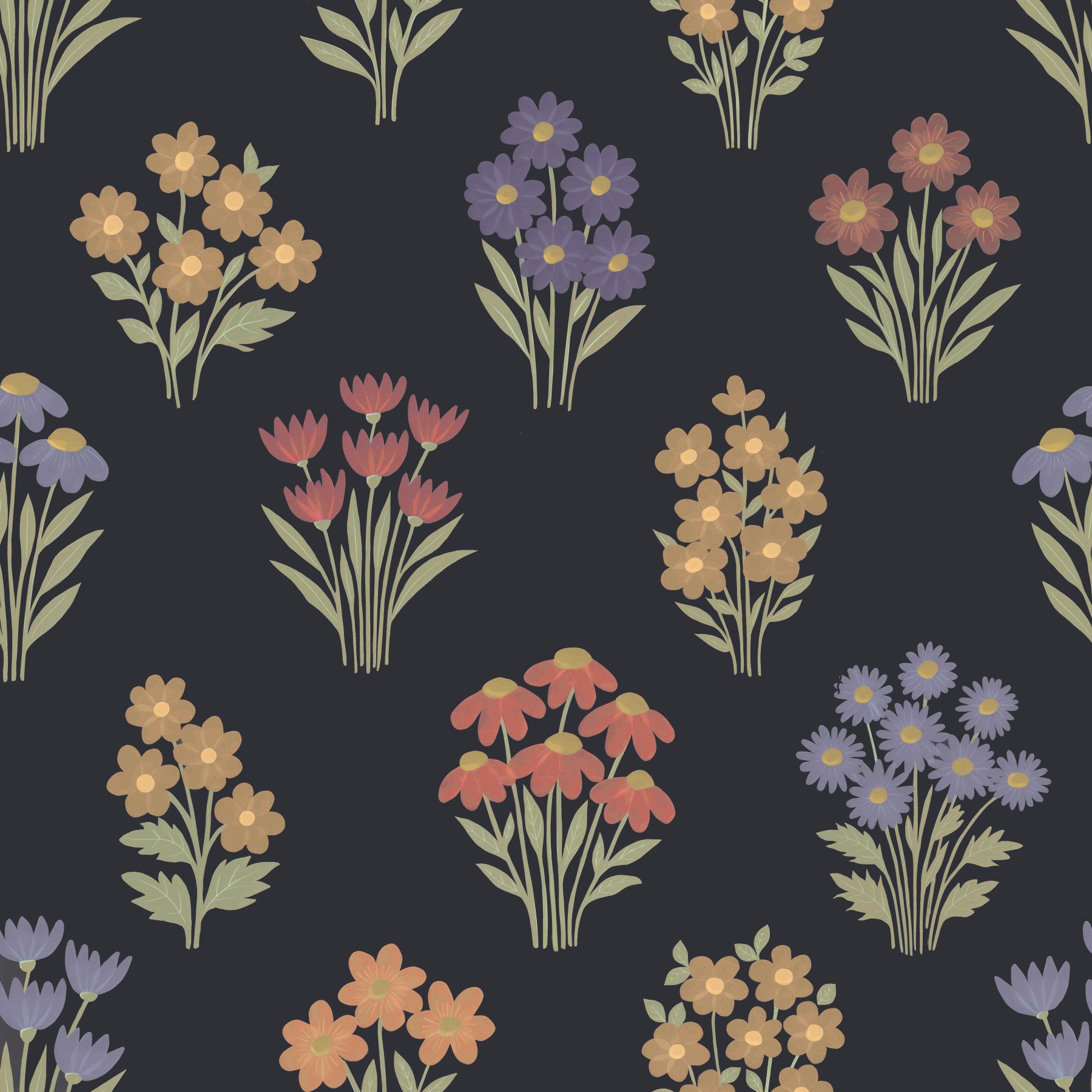 Embrace the scholarly charm of yesteryear with the Dark Academia Folk Floral Bouquet wallpaper. This design weaves together the romanticism of folk art with the introspective mood of the Dark Academia aesthetic. Against a backdrop of deep, muted charcoal, exquisitely rendered floral bouquets in shades of antique gold, dusky rose, and somber lavender emerge, reminiscent of pressed botanicals found within the pages of a forgotten tome. Each flower and leaf is meticulously crafted, evoking a sense of timeless elegance and intellectual curiosity. Invite the quiet beauty of a scholarly garden into your space, creating an atmosphere that inspires both contemplation and creativity. Perfect for studies, libraries, or any room where you wish to cultivate a sense of refined nostalgia and artistic expression.