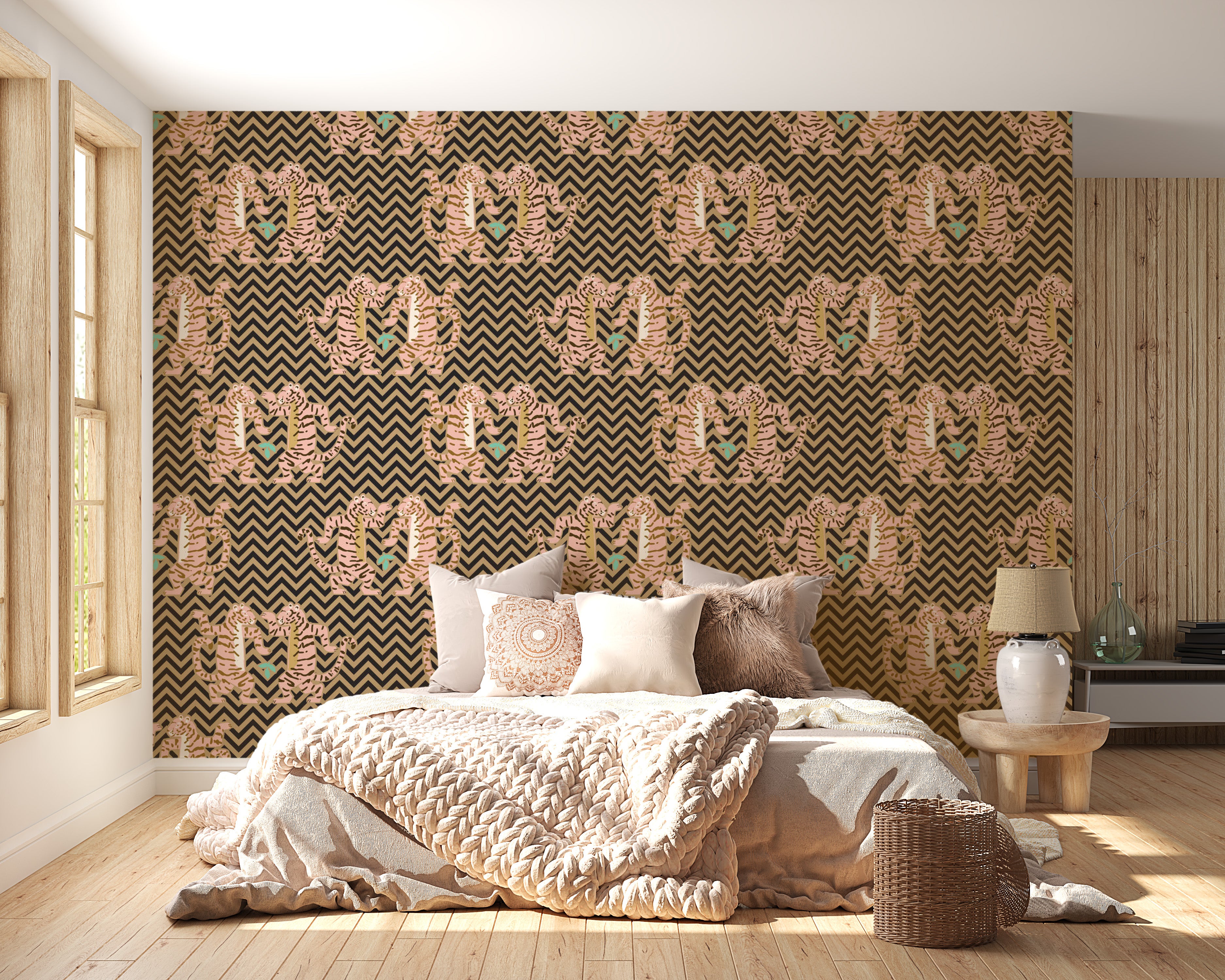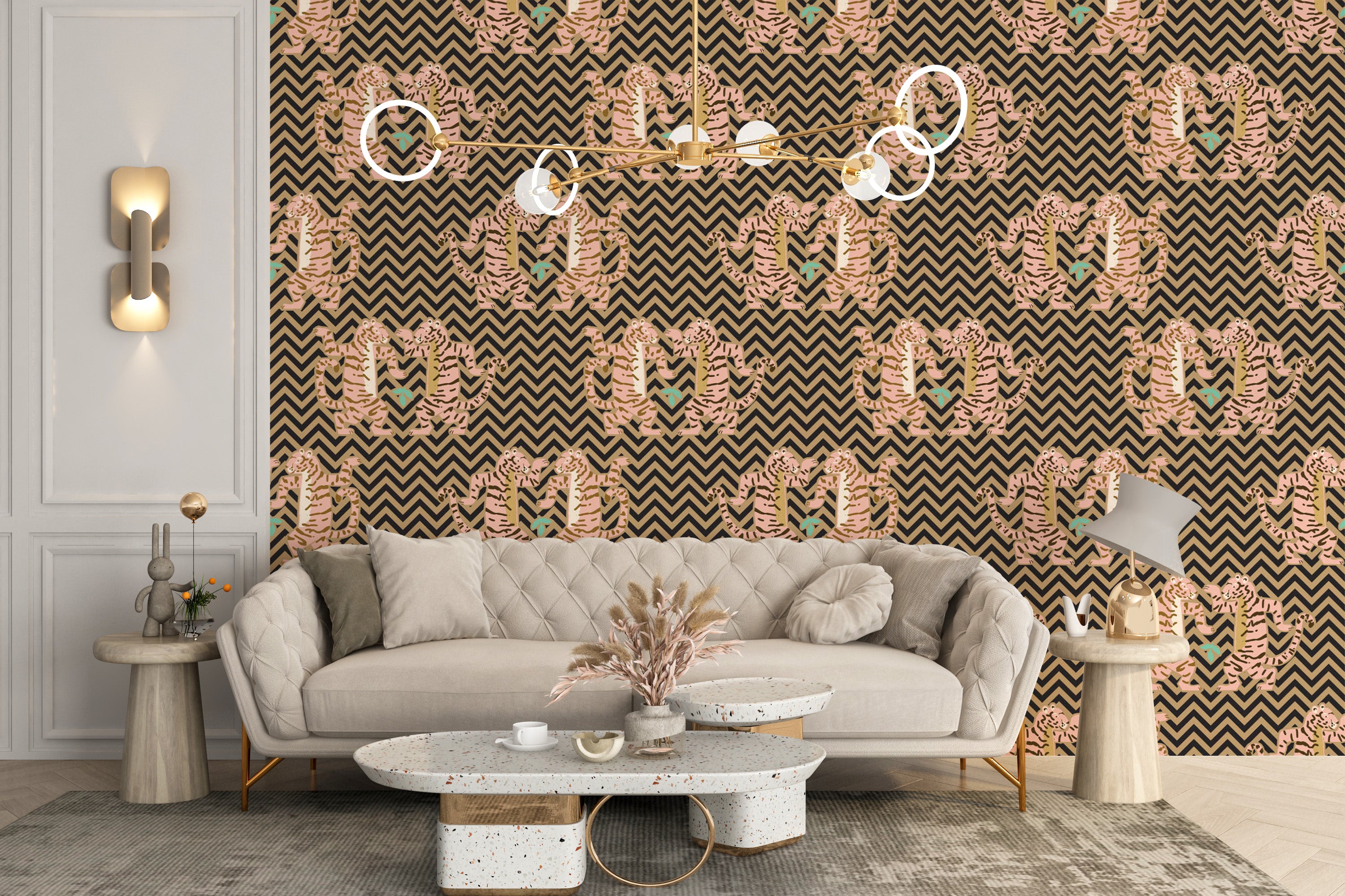 Tiger-themed zigzag wallpaper for bold interior decor.