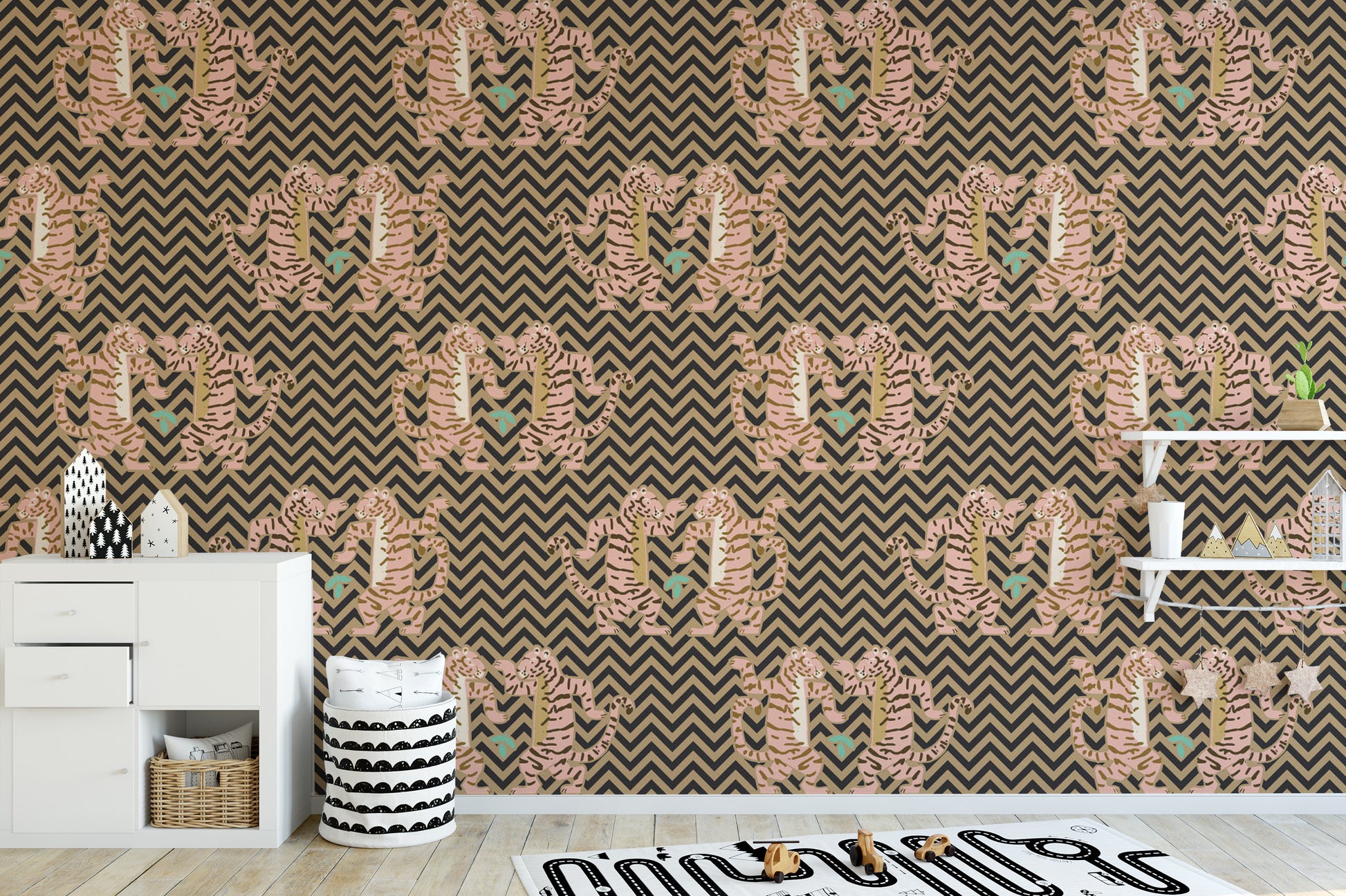 Bold dark sand wallpaper with tiger and zigzag motifs