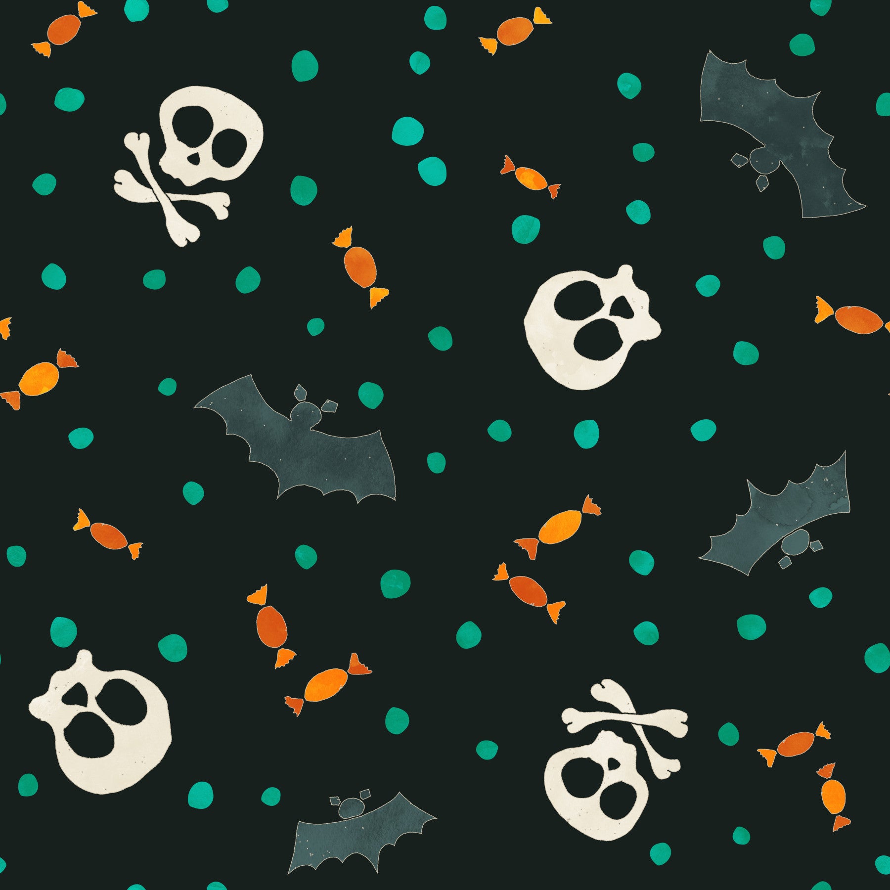 Get ready for Halloween with this cheerful wallpaper! Bats, skulls, candies, and dots scatter across a dark backdrop. The playful illustration style offers a vintage-inspired feel. The bright orange and teal colors against the dark background makes it eye-catching and fun. This wallpaper for walls brightens up a kid's bedroom, game room or even a quirky office! This spooky yet sweet design spreads smiles and creates a festive mood.