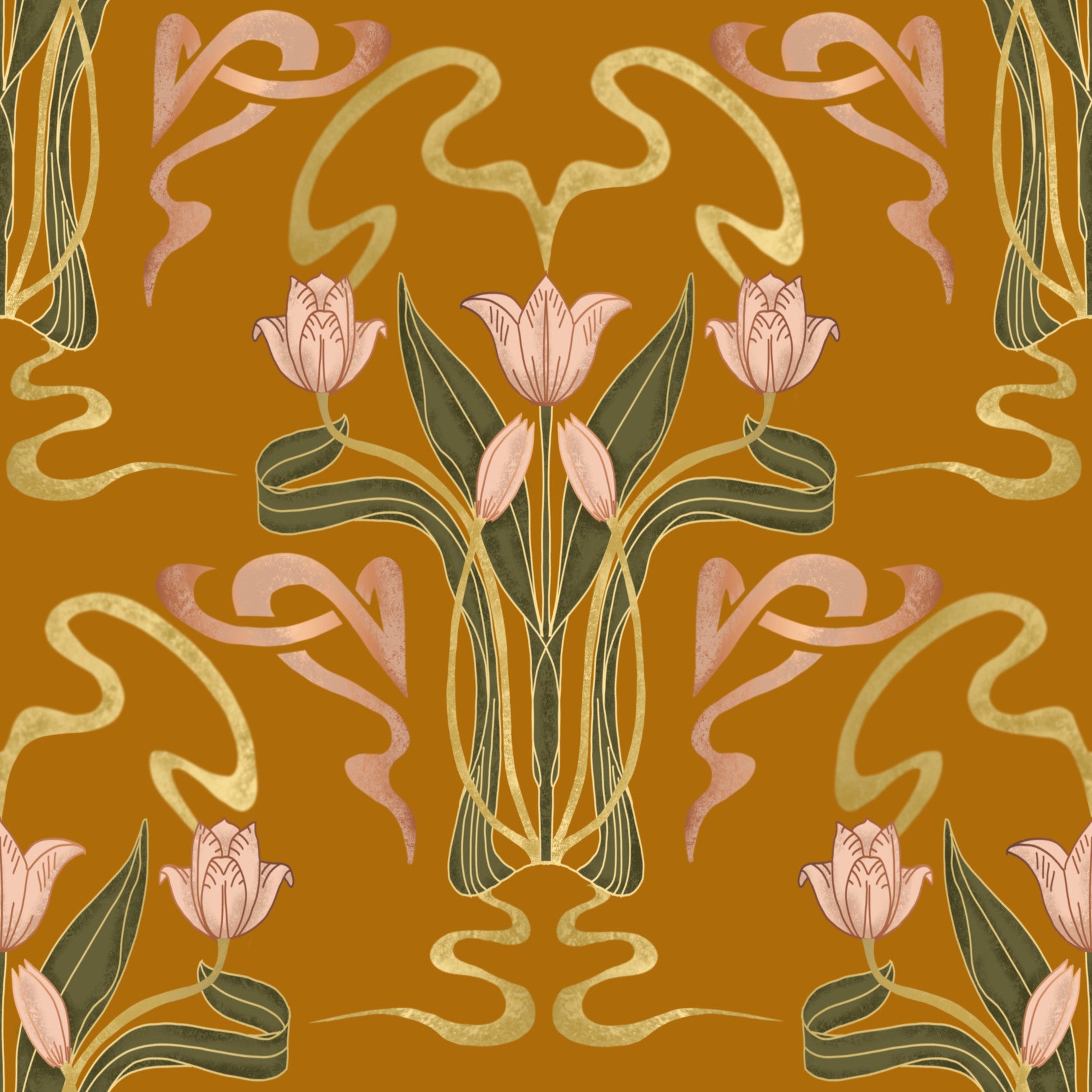 Embrace elegance with this Art Deco Floral Nouveau wallpaper. A rich golden ochre background provides the perfect backdrop for delicate blush pink tulips and flowing Art Nouveau-inspired lines in gold and muted rose gold. The design is both sophisticated and calming, blending the geometric precision of Art Deco with the organic curves of the Nouveau style. This wallpaper exudes a sense of refined luxury and timeless beauty, ideal for adding a touch of vintage charm to any digital device. The intricate detailing and harmonious color palette create a visually stunning and peaceful atmosphere.
