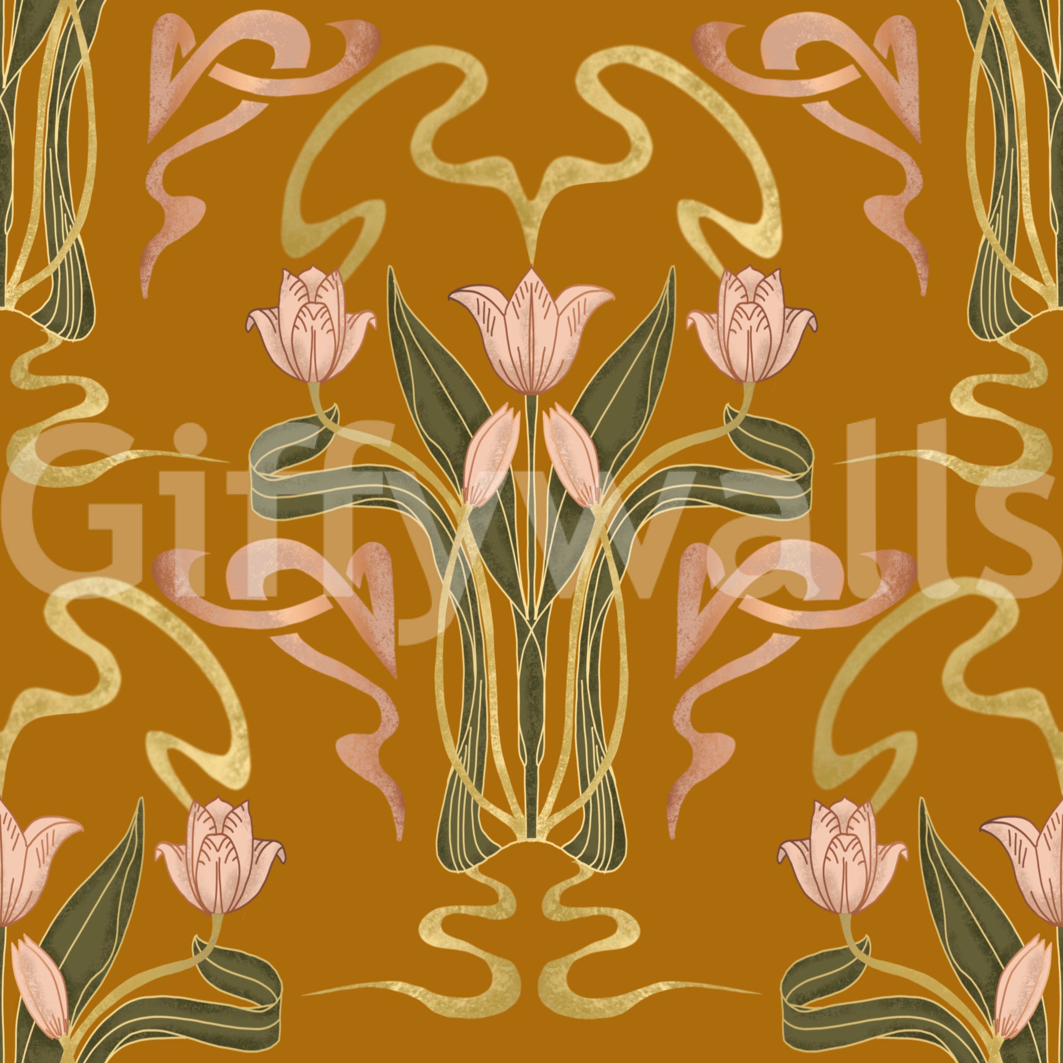 Deco Tulip Bloom - Art Deco Floral Nouveau Golden Ochre Wallpaper⁠