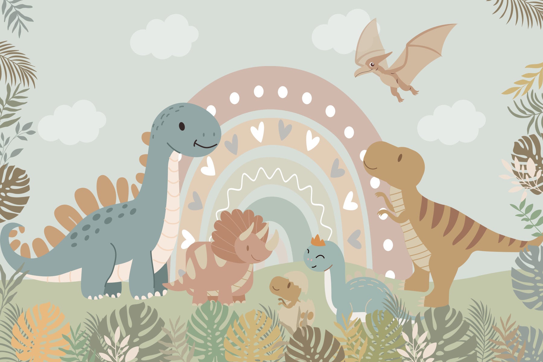 Invite whimsical charm into your home with this delightful dinosaur wallpaper. Friendly dinosaurs roam beneath a heart-dotted rainbow amidst botanical details. Muted tones create a comforting feel, suitable for a child’s bedroom or play area. Use this unique wallpaper for walls to add a creative and calming touch to kids interior decor. The gentle patterns and lovable dinosaur characters bring a fun and creative atmosphere, creating a delightful space.