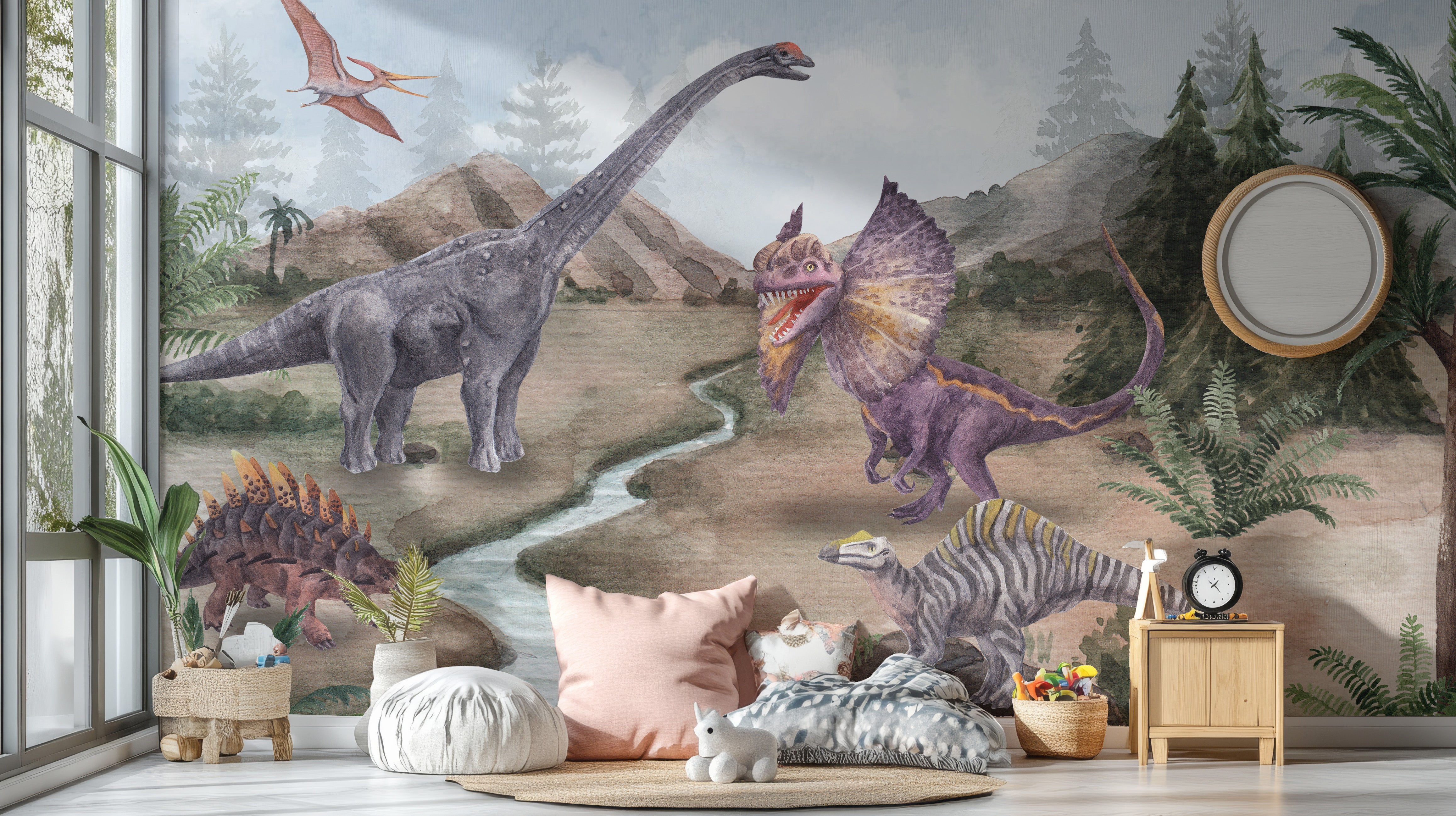 Experience a prehistoric journey with our dinosaur era wall mural. Ideal for sparking young minds, this captivating dinosaur wallpaper mural showcases a lush Mesozoic landscape teeming with majestic dinosaurs. The detailed illustration promises a visual feast, enhancing any room's appeal while fueling curiosity and wonder in the world of these ancient giants. It's a timeless addition to your home, offering both education and enjoyment in one striking visual statement.
