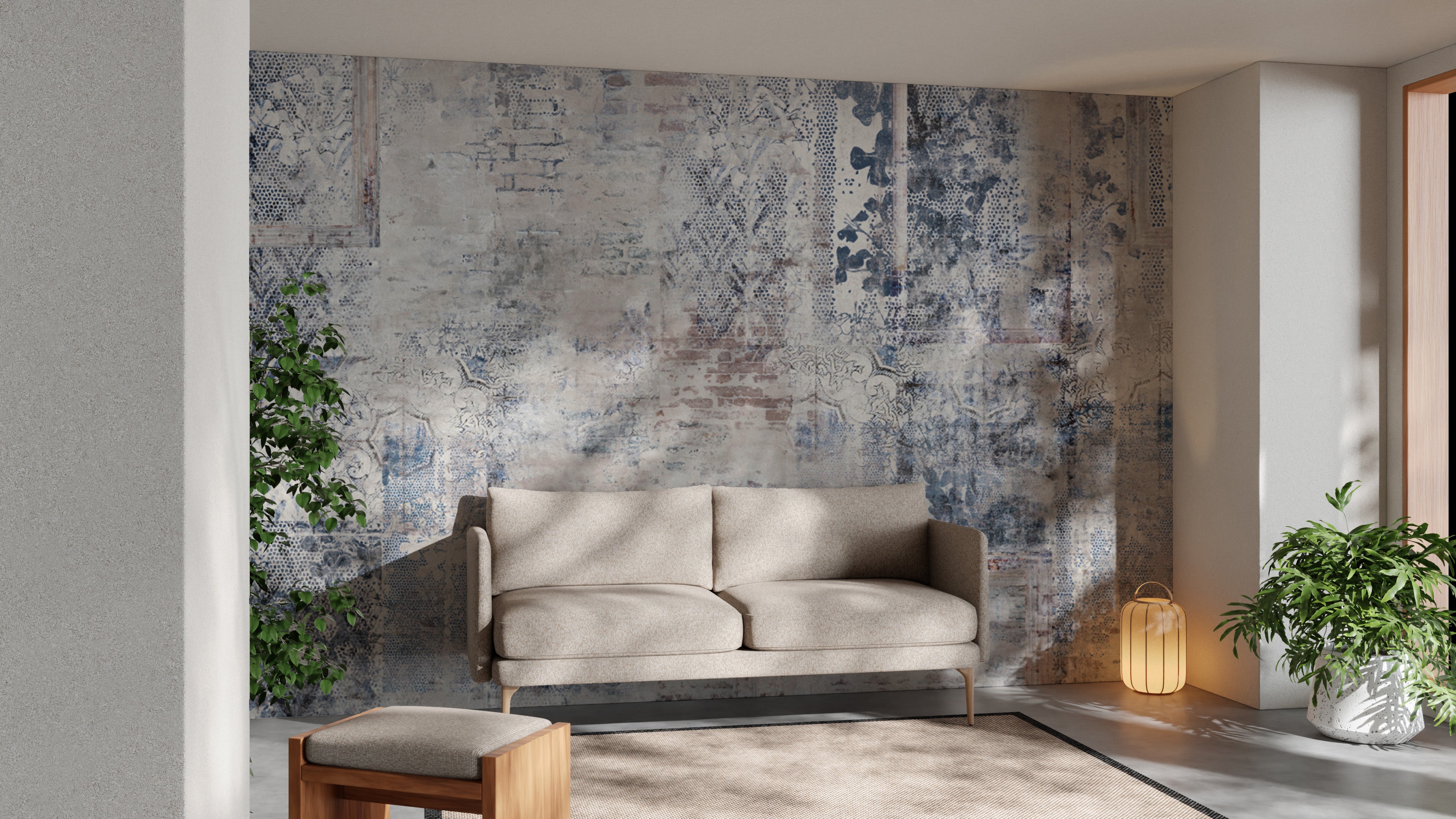 Vintage floral wallpaper with distressed brick textures