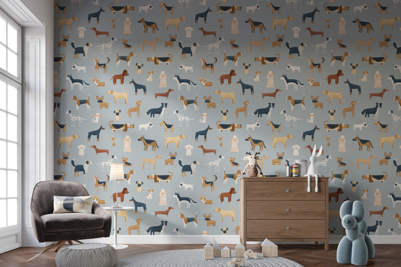 Create a playful haven for your little one with our diverse dog breeds nursery wallpaper. Each roll is a celebration of the joy and friendship that our four-legged friends bring. With an array of breeds illustrated in warm, inviting colors, this wallpaper is more than just a backdrop it's a storybook of tails and tales that will grow with your child. It's perfect for igniting young imaginations and fostering a love for animals. Easy to apply and durable, this nursery wallpaper will be a cherished part of your child's room as they go from toddling to storytelling.