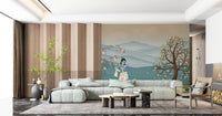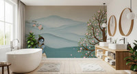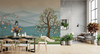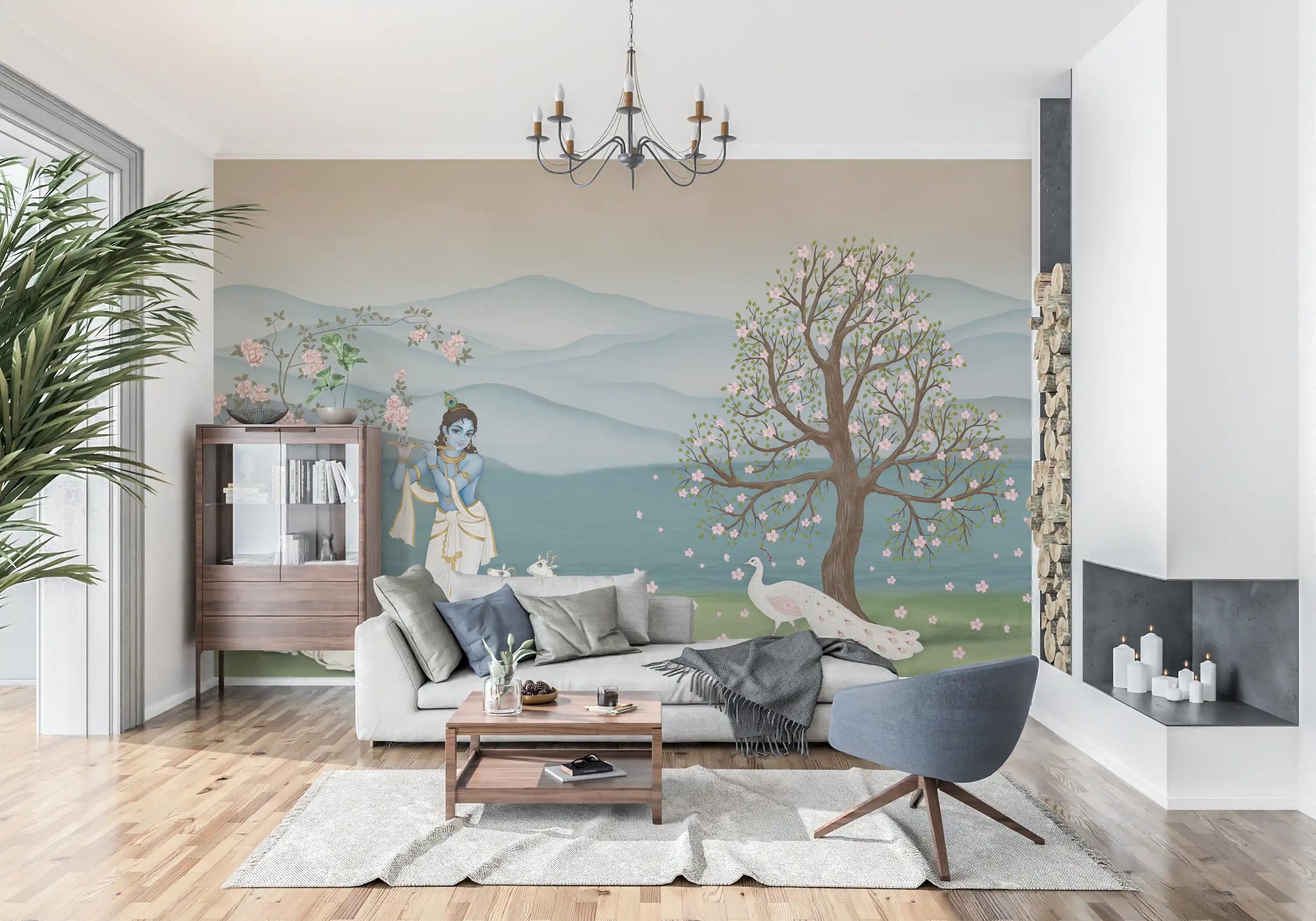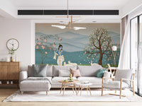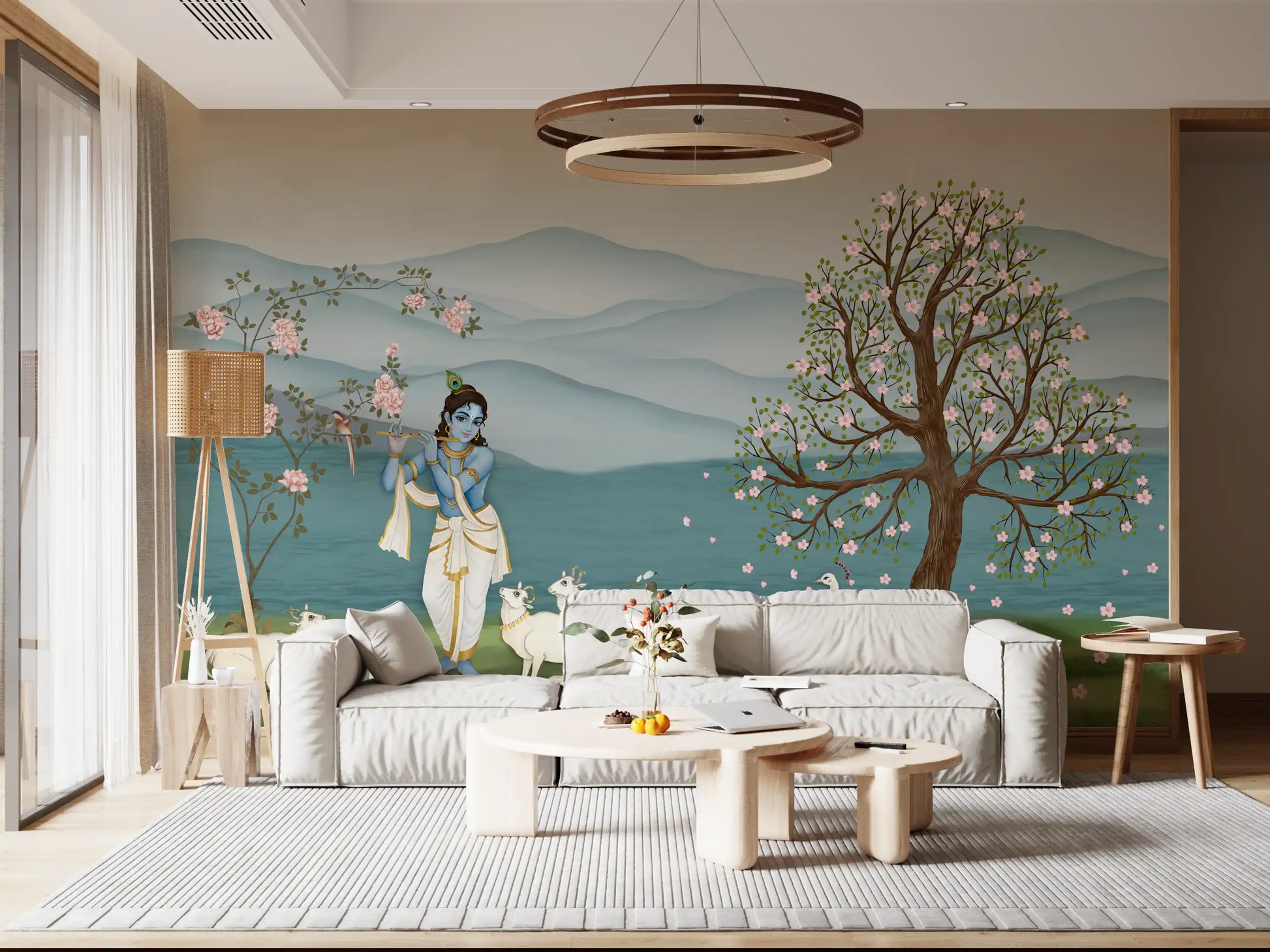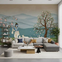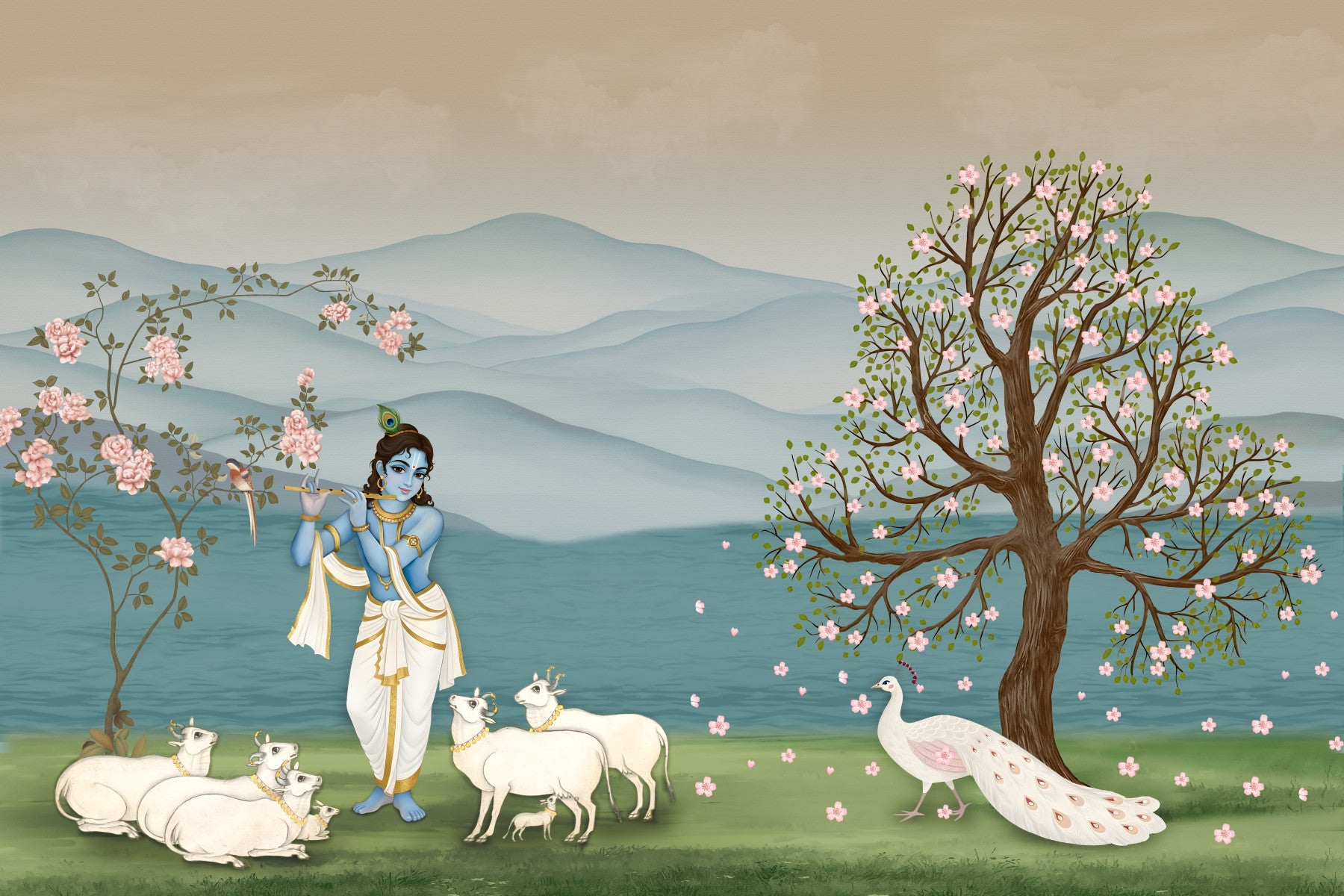 Transform your living space with this exquisite wallpaper for walls, depicting the serene Lord Krishna. He gracefully plays his flute amidst a peaceful herd of white cows and a stunning white peacock. Delicate pink blossoms adorn two flourishing trees, framing a backdrop of gentle blue-green mountains and still waters. This design uses a soft palette of serene blues, verdant greens, and tender pinks, creating a tranquil atmosphere. Perfect for a calming bedroom retreat, a spiritual meditation area, or a vibrant living room, this mural invites peace and beauty into your home. It creates an aura of divine harmony and natural elegance, enhancing any interior.