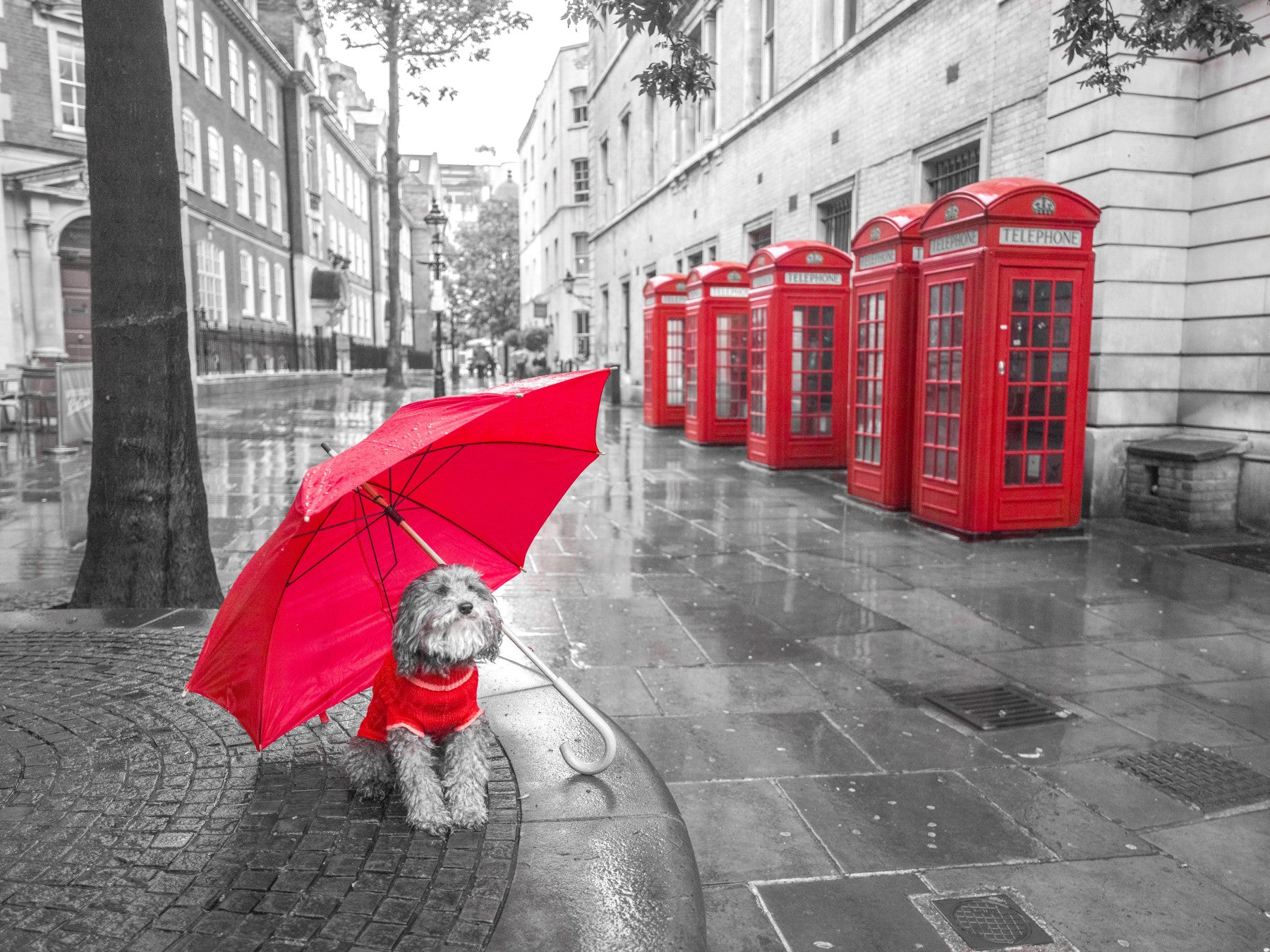 Adorn your home with the whimsical charm of our Dog with Umbrella in London Wall Mural. This delightful mural wallpaper captures a charming dog sitting patiently under a bright red umbrella on a wet, cobbled London street. In the background, a row of iconic red telephone boxes stands out against the grayscale buildings, highlighting the quaint British atmosphere. It's an ideal wallpaper for walls to introduce unique character and a sense of playful sophistication to any room, ensuring your home feels both inviting and beautifully connected to the distinct charm of London on a rainy day.